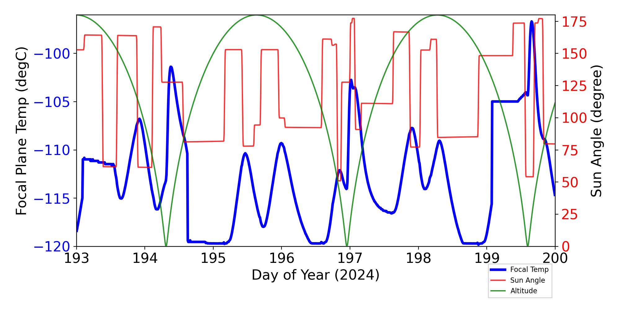 Weekly focal plane temperature with sun angle, earth angle, and altitude overplotted. Sun angle is the solar array angle, that is the angle between the sun and the optical axis (+X axis). The earth angle is the angle between earth and the ACIS radiator (+Z axis). Altitude varies from 34 kkm to 128 kkm.