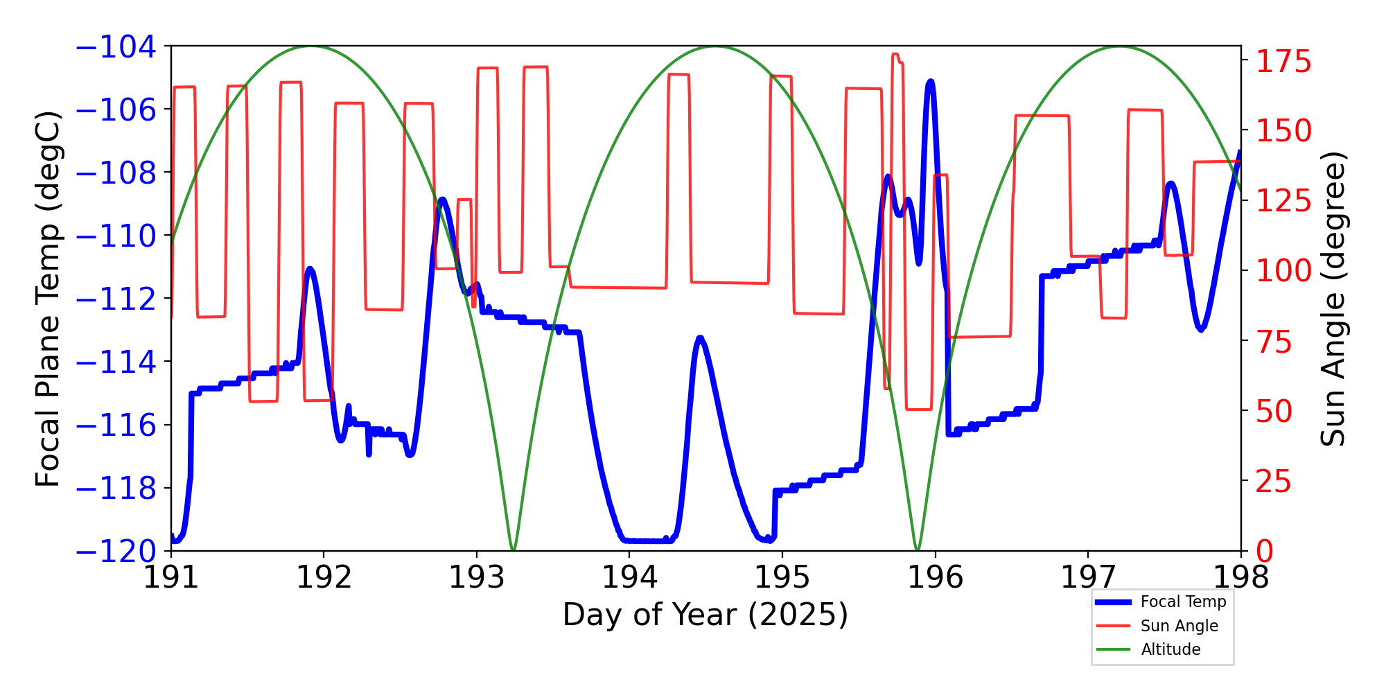 Weekly focal plane temperature with sun angle, earth angle, and altitude overplotted. Sun angle is the solar array angle, that is the angle between the sun and the optical axis (+X axis). The earth angle is the angle between earth and the ACIS radiator (+Z axis). Altitude varies from 34 kkm to 128 kkm.