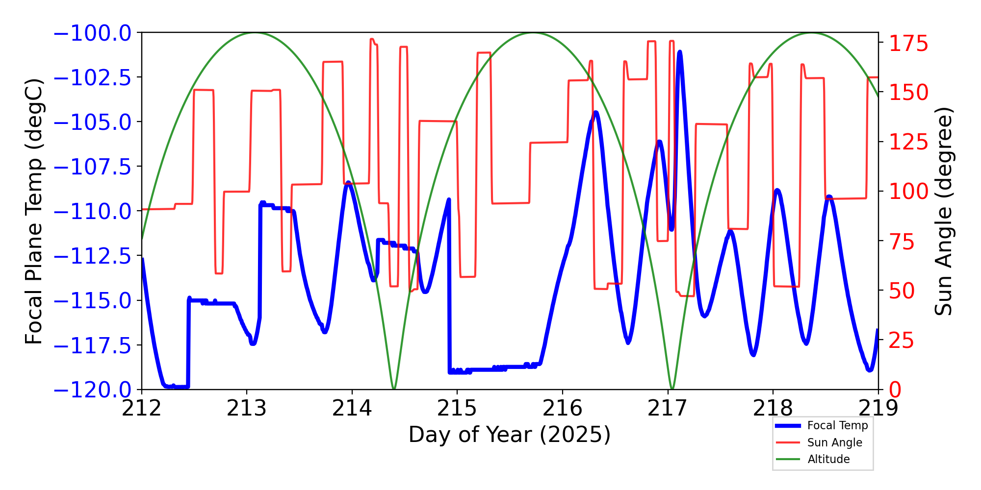 Weekly focal plane temperature with sun angle, earth angle, and altitude overplotted. Sun angle is the solar array angle, that is the angle between the sun and the optical axis (+X axis). The earth angle is the angle between earth and the ACIS radiator (+Z axis). Altitude varies from 34 kkm to 128 kkm.