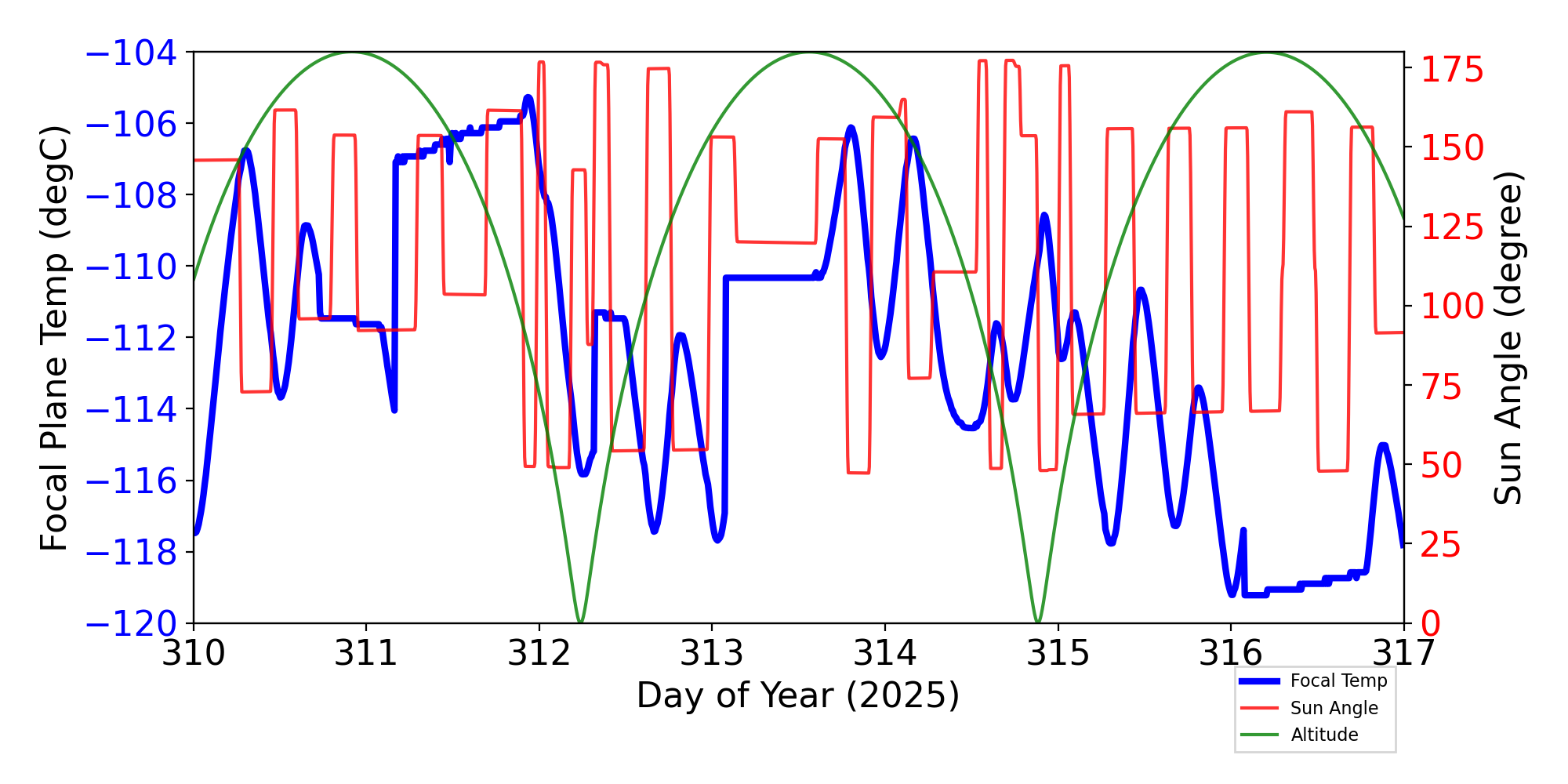 Weekly focal plane temperature with sun angle, earth angle, and altitude overplotted. Sun angle is the solar array angle, that is the angle between the sun and the optical axis (+X axis). The earth angle is the angle between earth and the ACIS radiator (+Z axis). Altitude varies from 34 kkm to 128 kkm.