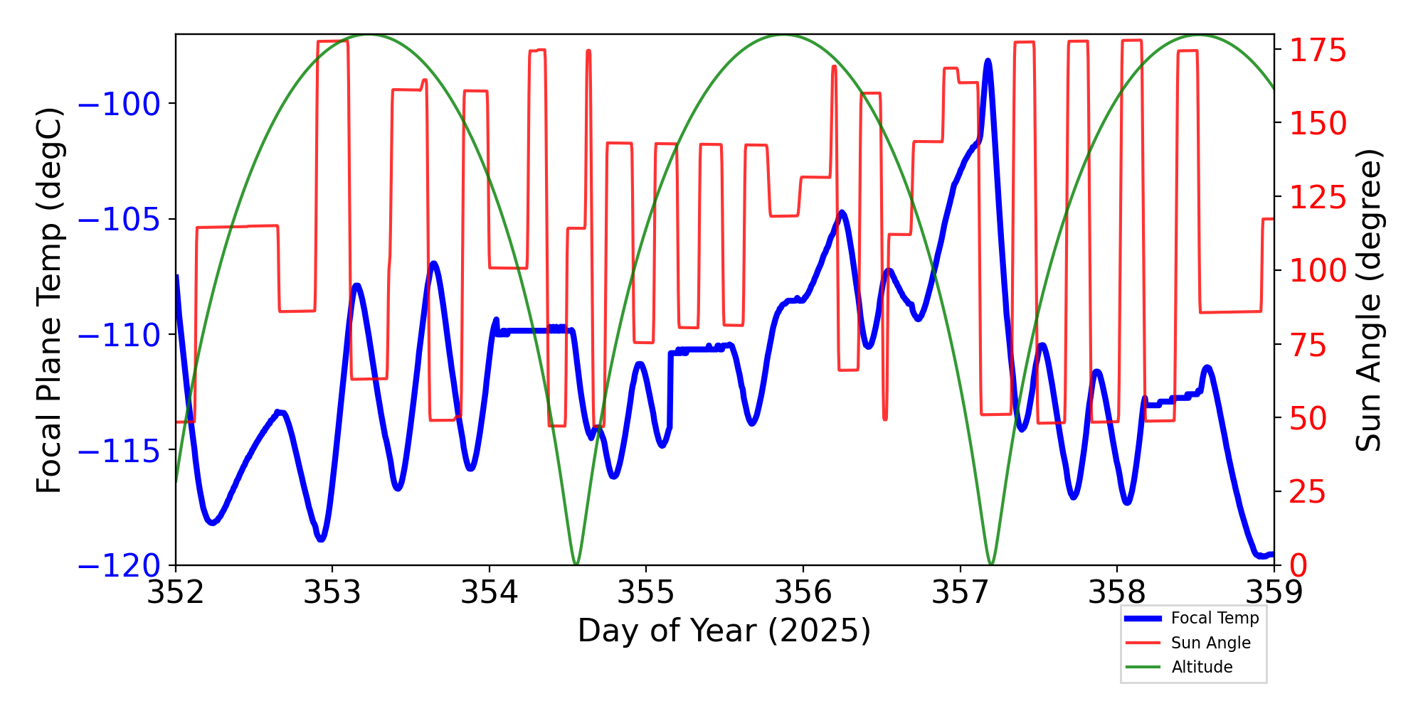 Weekly focal plane temperature with sun angle, earth angle, and altitude overplotted. Sun angle is the solar array angle, that is the angle between the sun and the optical axis (+X axis). The earth angle is the angle between earth and the ACIS radiator (+Z axis). Altitude varies from 34 kkm to 128 kkm.