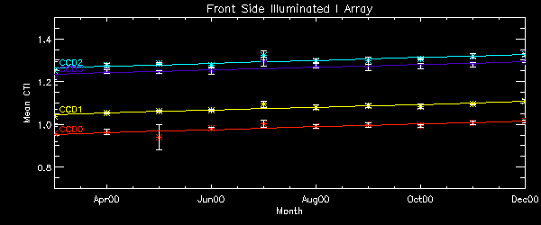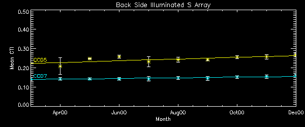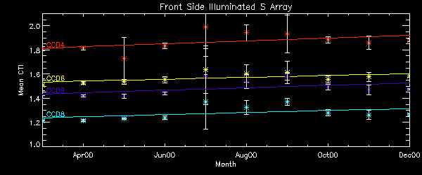 CTI slopes were computed for data point after DOM 200 and inside of 1 sigma deviation. Using only data point in 1 sigma range, we drop high temperature observations, squeegy observations, and other outliers. A independent variable is date, and a dependent variable is CTI. Note: Unit is cti/day from this month report. Front Side Illuminated S Array Node 0 Node 1 Node 2 Node 3 CCD4 4.869e-8 5.462e-8 5.673e-8 5.529e-8 CCD6 3.562e-8 3.828e-8 4.188e-8 3.733e-8 CCD8 4.052e-8 4.358e-8 4.180e-8 3.870e-8 CCD9 4.369e-8 4.573e-8 4.491e-8 3.743e-8 AVG 4.283e-8 Front Side Illuminated I Array Node 0 Node 1 Node 2 Node 3 CCD0 2.050e-8 2.759e-8 2.648e-8 2.184e-8 CCD1 2.260e-8 2.597e-8 2.363e-8 1.883e-8 CCD2 2.303e-8 2.705e-8 2.720e-8 2.167e-8 CCD3 2.133e-8 2.430e-8 2.678e-8 2.247e-8 AVG 2.230e-8 Detrended AVG 1.465e-8 Back Side Illuminated S Array Node 0 Node 1 Node 2 Node 3 CCD5 4.182e-9 4.601e-9 3.274e-9 7.818e-10 AVG: 2.754e-9 CCD7 3.184e-9 4.879e-9 4.425e-9 3.017e-9 AVG 4.090e-9