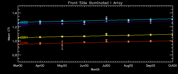 CTI slopes were computed for data point after DOM 200 and inside of 1 sigma deviation. Using only data point in 1 sigma range, we drop high temperature observations, squeegy observations, and other outliers. A independent variable is date, and a dependent variable is CTI. Note: Unit is cti/day from this month report. Front Side Illuminated S Array Node 0 Node 1 Node 2 Node 3 CCD4 6.982e-8 7.573e-8 7.893e-8 7.774e-8 CCD6 4.516e-8 5.284e-8 5.338e-8 5.007e-8 CCD8 6.038e-8 6.588e-8 6.278e-8 5.853e-8 CCD9 6.407e-8 6.772e-8 6.480e-8 5.689e-8 AVG 6.543e-8 Front Side Illuminated I Array Node 0 Node 1 Node 2 Node 3 CCD0 2.149e-8 2.977e-8 2.641e-8 2.376e-8 CCD1 2.250e-8 2.532e-8 2.254e-8 1.764e-8 CCD2 2.238e-8 2.670e-8 2.803e-8 2.096e-8 CCD3 2.180e-8 2.409e-8 2.536e-8 2.188e-8 AVG 2.255e-8 Detrended AVG 1.456e-8 Back Side Illuminated S Array Node 0 Node 1 Node 2 Node 3 CCD5 6.767e-10 1.881e-9 -1.075e-10 -1.383e-9 AVG: -5.931e-11 CCD7 1.392e-9 4.003e-9 3.203e-9 1.434e-9 AVG 2.727e-9