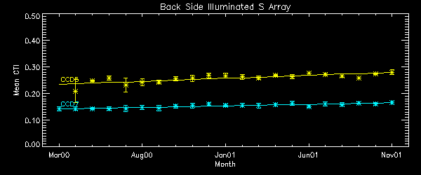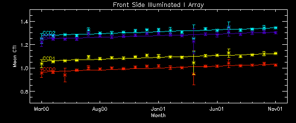 CTI slopes were computed for data point after DOM 200 and inside of 1 sigma deviation. Using only data point in 1 sigma range, we drop high temperature observations, squeegy observations, and other outliers. A independent variable is date, and a dependent variable is CTI. Note: Unit is cti/day from this month report. Front Side Illuminated S Array Node 0 Node 1 Node 2 Node 3 CCD4 1.415e-8 1.797e-8 1.848e-8 1.645e-8 CCD6 1.406e-8 1.700e-8 1.607e-8 1.498e-8 CCD8 1.257e-8 1.306e-8 1.273e-8 1.171e-8 CCD9 1.298e-8 1.632e-8 1.496e-8 1.102e-8 AVG 1.264e-8 Front Side Illuminated I Array Node 0 Node 1 Node 2 Node 3 CCD0 1.288e-8 1.724e-8 1.706e-8 1.451e-8 CCD1 1.367e-8 1.570e-8 1.620e-8 1.245e-8 CCD2 1.406e-8 1.643e-8 1.630e-8 1.269e-8 CCD3 1.299e-8 1.536e-8 1.484e-8 1.373e-8 AVG 1.336e-8 Detrended AVG 1.246e-8 Back Side Illuminated S Array Node 0 Node 1 Node 2 Node 3 CCD5 5.414e-9 6.310e-9 6.508e-9 2.852e-9 AVG: 4.930e-9 CCD7 3.138e-9 4.633e-9 4.813e-9 3.075e-9 AVG 3.979e-9