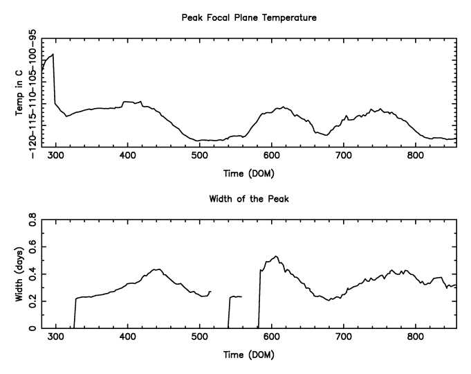 From this month, we are using 10 period moving averages to show trends of peak temperatures and peak widths. Note, the gaps in the width plot are due to missing/corrupted data.