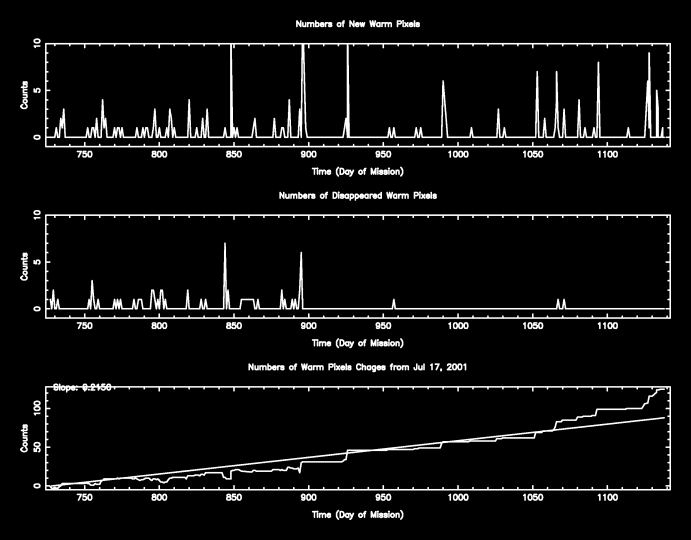 Warm pixels consistently showed a bias level more than 5 sigma away the chip's mean level during this period.