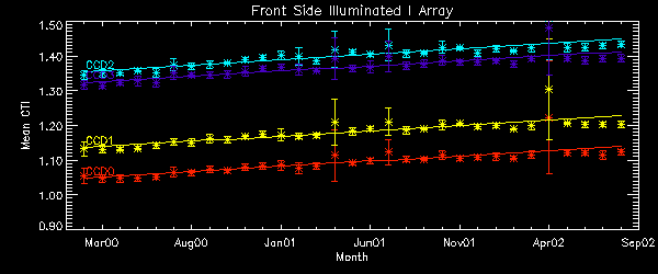 CTI slopes were computed for data point after DOM 200 and inside of 1 sigma deviation. Using only data point in 1 sigma range, we drop high temperature observations, squeegy observations, and other outliers. A independent variable is date, and a dependent variable is CTI. Note: Unit is cti/day from this month report. Front Side Illuminated S Array Node 0 Node 1 Node 2 Node 3 CCD4 1.134e-8 1.366e-8 1.544-e8 1.315e-8 CCD6 1.294e-8 1.443e-8 1.480e-8 1.337e-8 CCD8 1.055e-8 1.193e-8 1.015e-8 9.780e-9 CCD9 1.120e-8 1.371e-8 1.324e-8 9.235e-9 AVG 1.161e-8 Front Side Illuminated I Array Node 0 Node 1 Node 2 Node 3 CCD0 1.012e-8 1.270e-8 1.285e-8 1.051e-8 CCD1 1.028e-8 1.221e-8 1.173e-8 9.638e-9 CCD2 1.074e-8 1.293e-8 1.332e-8 9.652e-9 CCD3 1.040e-8 1.218e-8 1.222e-8 1.103e-8 AVG 1.058e-8 Back Side Illuminated S Array (not detrended) Node 0 Node 1 Node 2 Node 3 CCD5 4.615e-9 5.270e-9 4.933e-9 3.115e-9 AVG: 4.355e-9 CCD7 2.753e-9 4.016e-9 4.113e-9 2.728e-9 AVG 3.470e-9