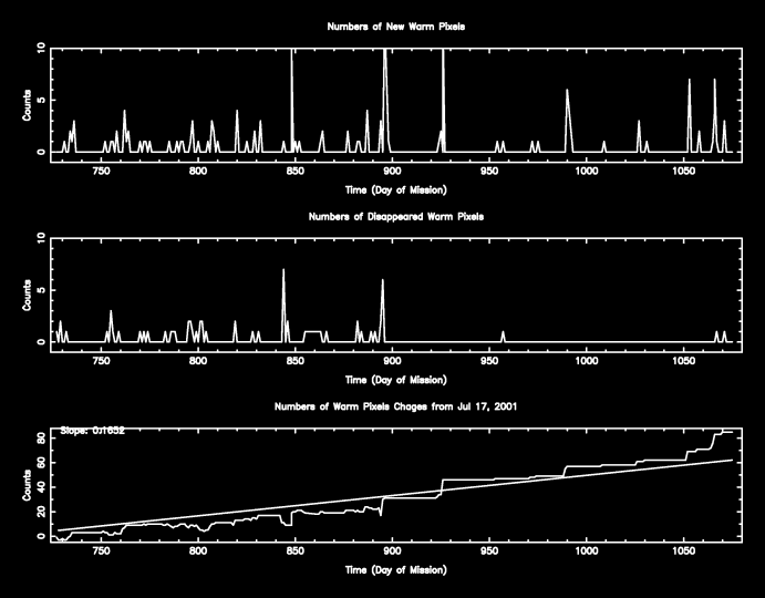 Warm pixels consistently showed a bias level more than 5 sigma away the chip's mean level during this period.