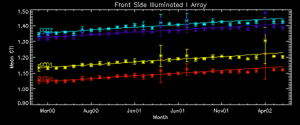 CTI slopes were computed for data point after DOM 200 and inside of 1 sigma deviation. Using only data point in 1 sigma range, we drop high temperature observations, squeegy observations, and other outliers. A independent variable is date, and a dependent variable is CTI. Note: Unit is cti/day from this month report. Front Side Illuminated S Array Node 0 Node 1 Node 2 Node 3 CCD4 9.263e-9 1.181e-8 1.308e-8 1.107e-8 CCD6 1.131e-8 1.313e-8 1.331e-8 1.197e-8 CCD8 9.291e-9 1.043e-8 9.050e-9 8.508e-9 CCD9 9.992e-9 1.236e-8 1.186e-8 8.317e-9 AVG 9.745e-9 Front Side Illuminated I Array Node 0 Node 1 Node 2 Node 3 CCD0 9.354e-9 1.243e-8 1.198e-8 9.838e-9 CCD1 9.547e-9 1.151e-8 1.142e-8 9.096e-9 CCD2 1.003e-8 1.240e-8 1.245e-8 8.807e-9 CCD3 9.474e-9 1.144e-8 1.132e-8 1.004e-8 AVG 9.659e-9 Back Side Illuminated S Array (not detrended) Node 0 Node 1 Node 2 Node 3 CCD5 5.128e-9 5.786e-9 5.538e-9 3.335e-9 AVG: 4.745e-9 CCD7 3.010e-9 4.229e-9 4.447e-9 2.893e-9 AVG 3.739e-9