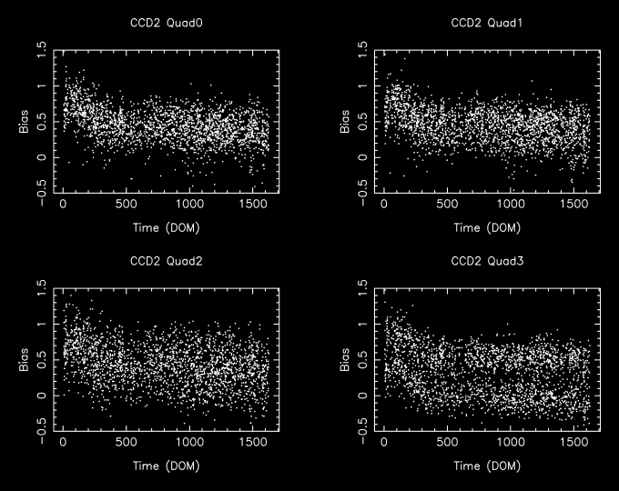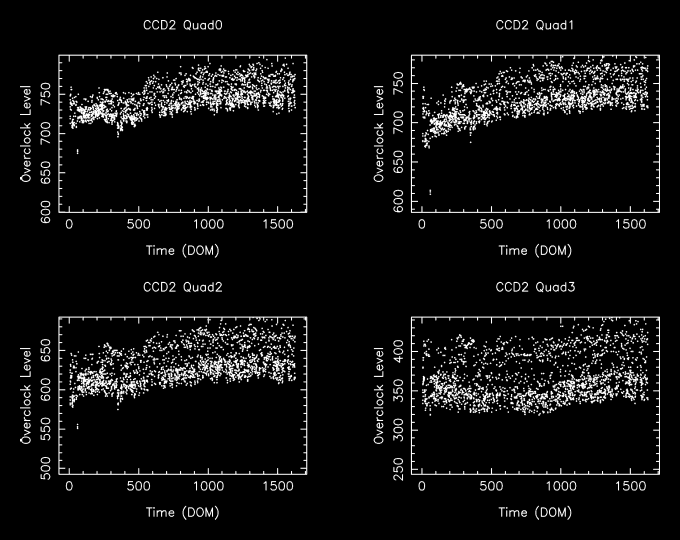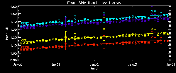 CTI slopes were computed for data point after DOM 200 and inside of 1 sigma deviation. Using only data point in 1 sigma range, we drop high temperature observations, squeegy observations, and other outliers. A independent variable is date, and a dependent variable is CTI. Note: Unit is cti/day from this month report. Front Side Illuminated S Array Node 0 Node 1 Node 2 Node 3 CCD4 8.670e-9 1.124e-8 1.159e-8 1.007e-8 CCD6 1.010e-8 1.102e-8 1.138e-8 1.038e-8 CCD8 7.635e-9 8.518e-9 7.826e-9 7.358e-9 CCD9 8.558e-9 1.081e-8 1.005e-8 7.207e-9 AVG 8.621e-9 Front Side Illuminated I Array Node 0 Node 1 Node 2 Node 3 CCD0 7.838e-9 1.016e-8 1.010e-8 8.565e-9 CCD1 8.482e-9 9.879e-9 9.640e-9 7.556e-9 CCD2 8.782e-9 1.054e-8 1.023e-8 8.218e-9 CCD3 8.419e-9 1.008e-8 1.012e-8 8.965e-9 AVG 8.558e-9 Back Side Illuminated S Array (not detrended) Node 0 Node 1 Node 2 Node 3 CCD5 3.590e-9 3.730e-9 3.795e-9 2.485e-9 AVG: 3.233e-9 CCD7 2.190e-9 3.065e-9 3.192e-9 2.075e-9 AVG 2.674e-9