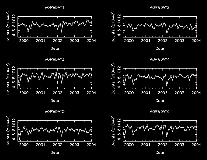 Statistics: # IMAGE NPIX MEAN RMS MIN MAX ACIS_dec03 6004901 4.8694 21.800 0.0 33074.0 I2 node 0 262654 3.511064 3.675343 0.0 132.0 I2 node 1 262654 4.364358 6.910787 0.0 239.0 I2 node 2 262654 5.193563 10.492523 0.0 325.0 I2 node 3 262654 5.779672 14.004019 0.0 412.0 I3 node 0 262654 6.465182 14.389301 0.0 411.0 I3 node 1 262654 5.450128 10.724986 0.0 319.0 I3 node 2 262654 4.732652 7.205562 0.0 227.0 I3 node 3 262654 3.524420 3.571756 0.0 131.0 S2 node 0 262397 5.732143 2.782728 0.0 44.0 S2 node 1 262397 7.782181 23.980880 0.0 499.0 S2 node 2 262397 6.309043 3.052524 0.0 59.0 S2 node 3 262397 6.049010 2.845757 0.0 30.0 S3 node 0 262397 10.638662 19.891833 0.0 563.0 S3 node 1 262397 15.430455 49.335874 0.0 948.0 S3 node 2 262397 7.908825 3.440330 0.0 58.0 S3 node 3 262397 6.923917 3.147837 0.0 32.0