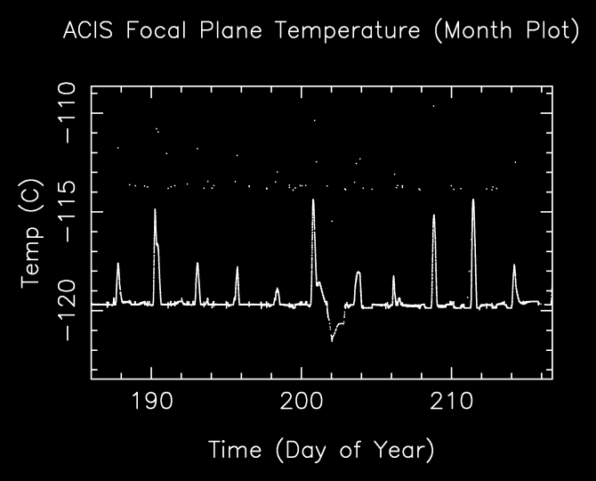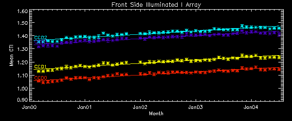 From this month, we report CTIs with a refined data definition. CTIs were computed for the temperature dependency corrected data. Please see new CTI page for detailed explanation. CTI's are computed for Mn K alpha, and defined as slope/intercept x10^4 of row # vs ADU. Data file here
