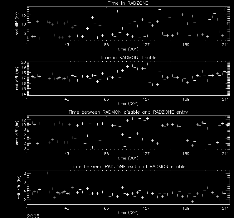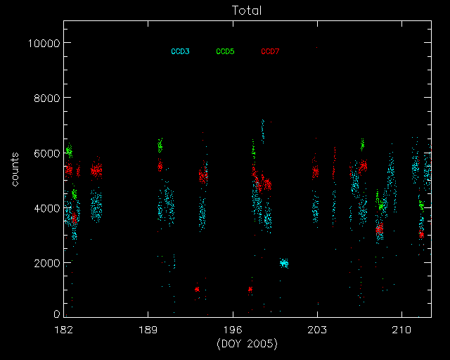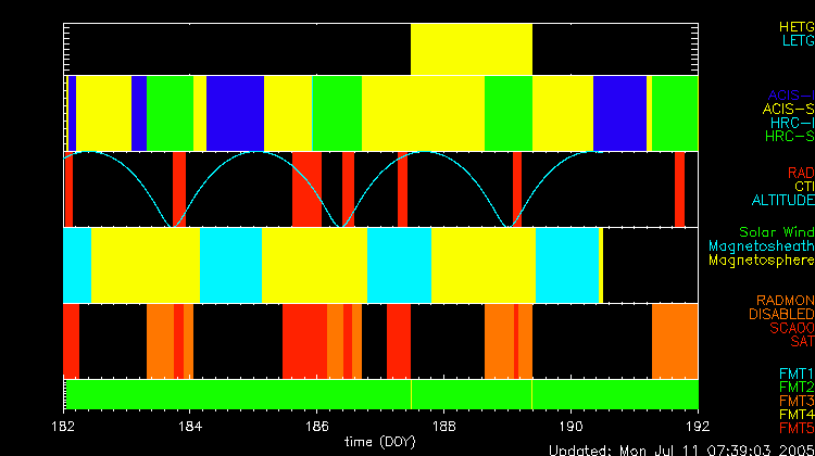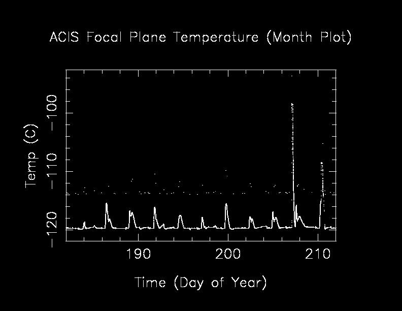 The following is a plot of focal plane temperature and sun angle, earth angle, and altitude. July has seen an increases number of "shoulders", as was seen in February. The shoulders appear on perigee egress now and on perigee ingress 6 months ago.