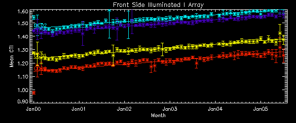 We report CTIs with a refined data definition. CTIs were computed for the temperature dependency corrected data. Please see new CTI page for detailed explanation. CTI's are computed for Mn K alpha, and defined as slope/intercept x10^4 of row # vs ADU. Data file here