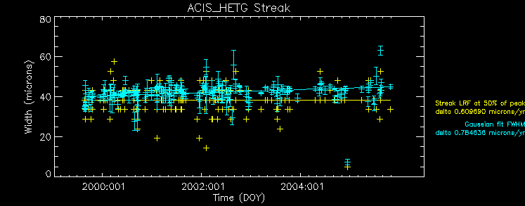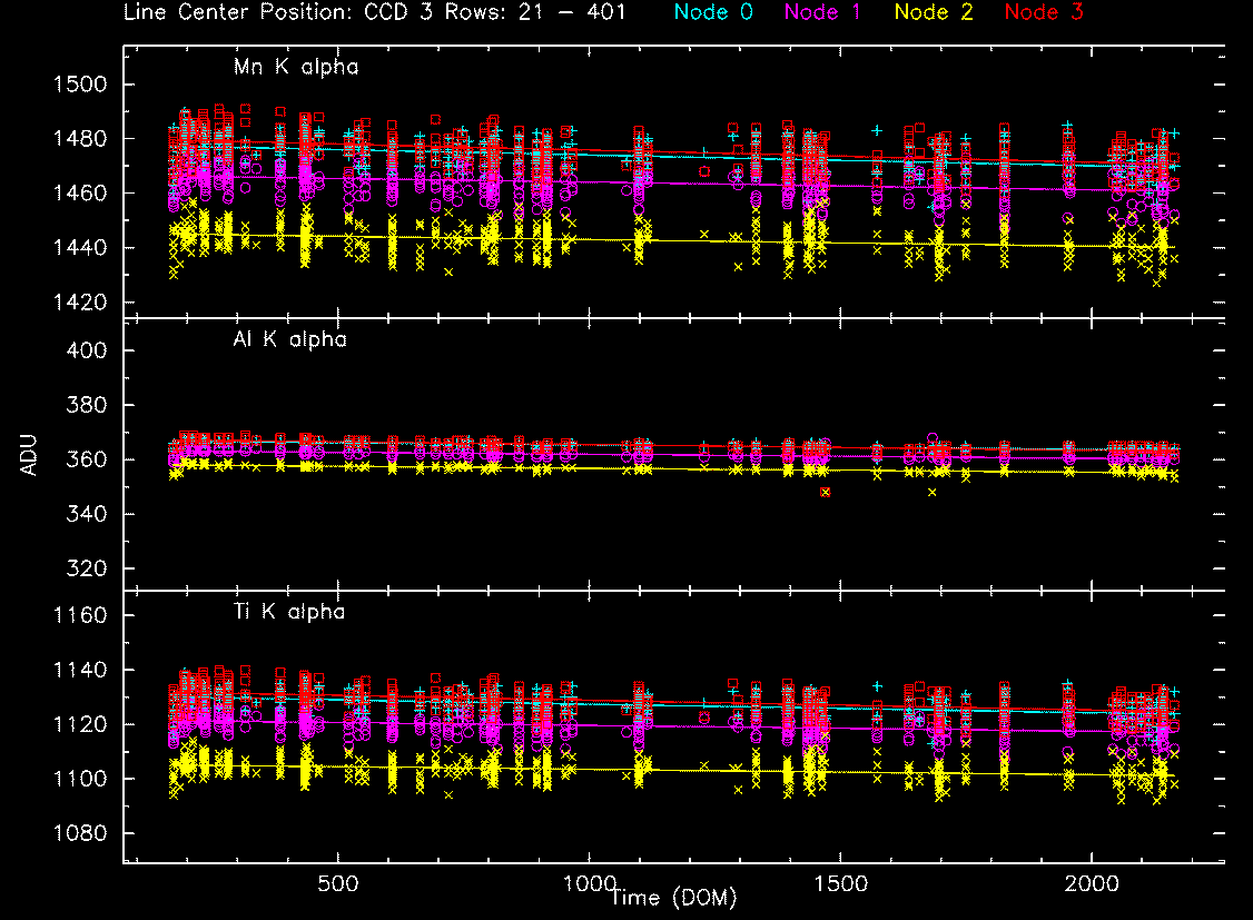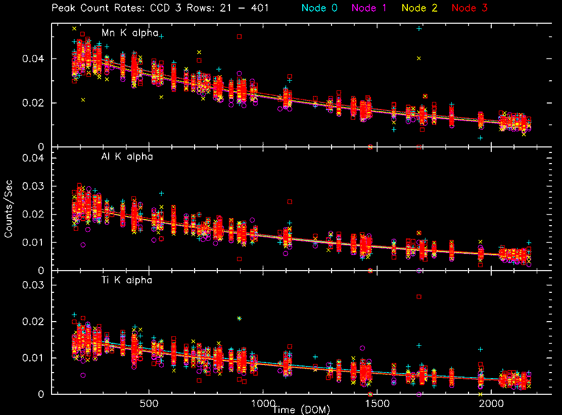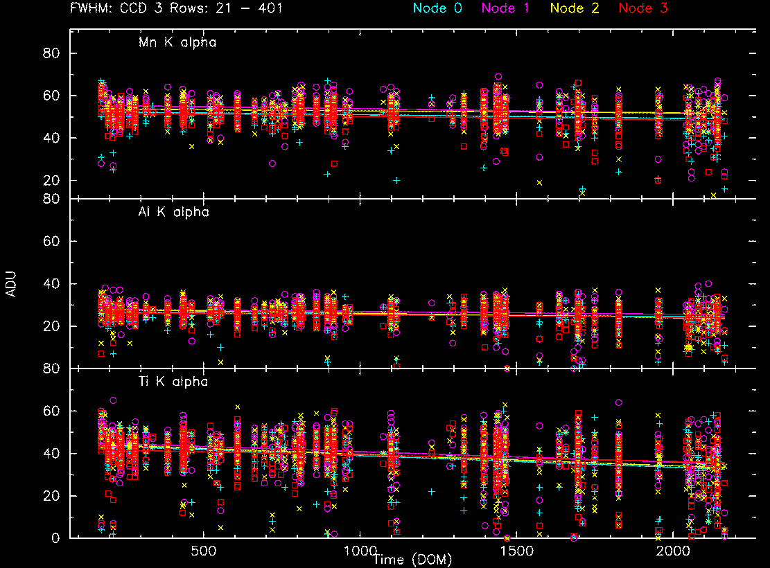 We collected data from acis histogram mode data, and created trend plots of peak portions and peak widths against time (DOM). The peaks were estimated by fitting a simple Gaussian on three peaks (Al, Ti, and Mn), and the widths were estimated by a width at the half max from the peak.