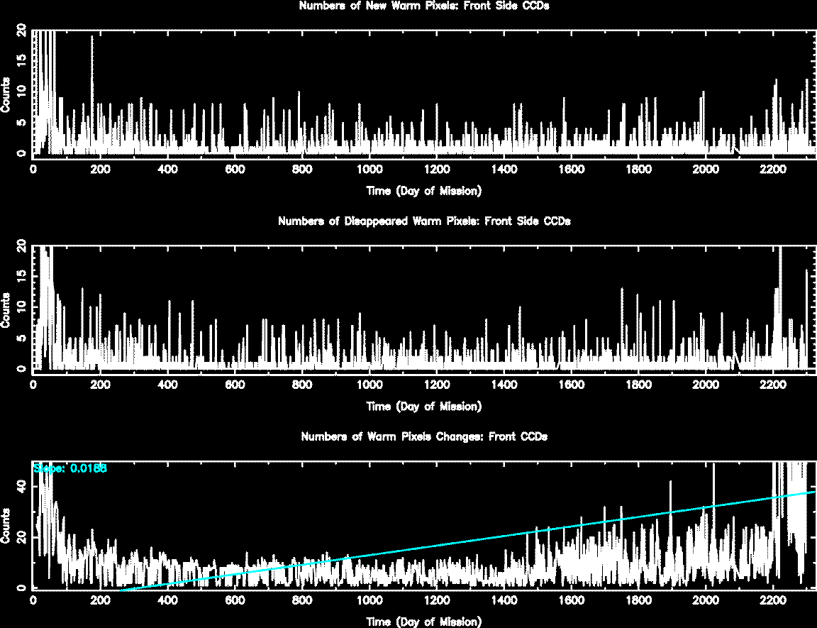 The plots below were generated with a new warm pixel finding script. Please see Acis Bad Pixel Page for details.