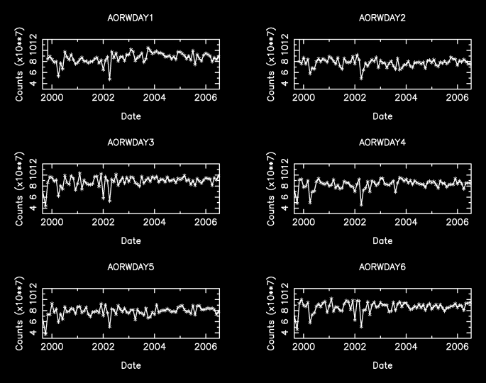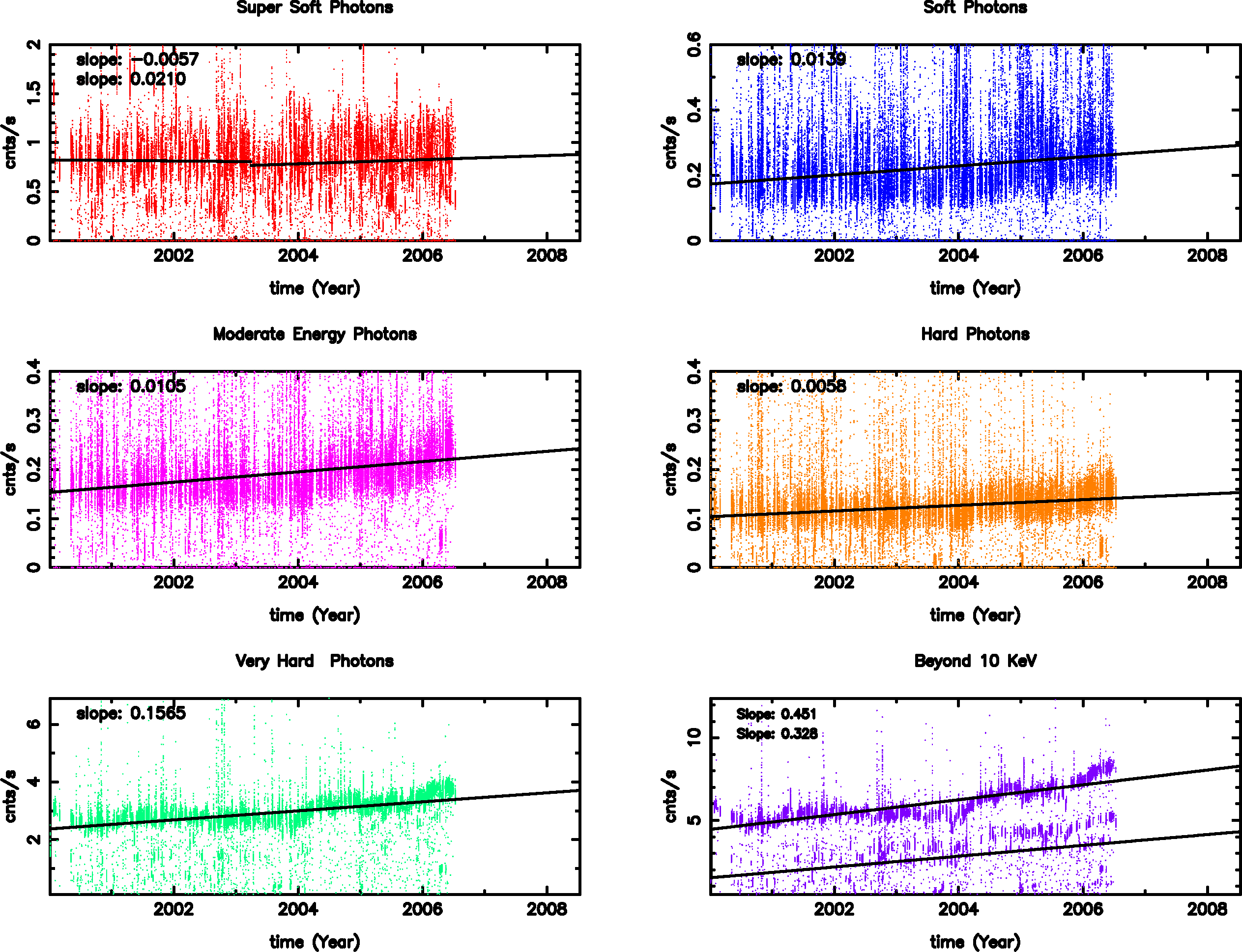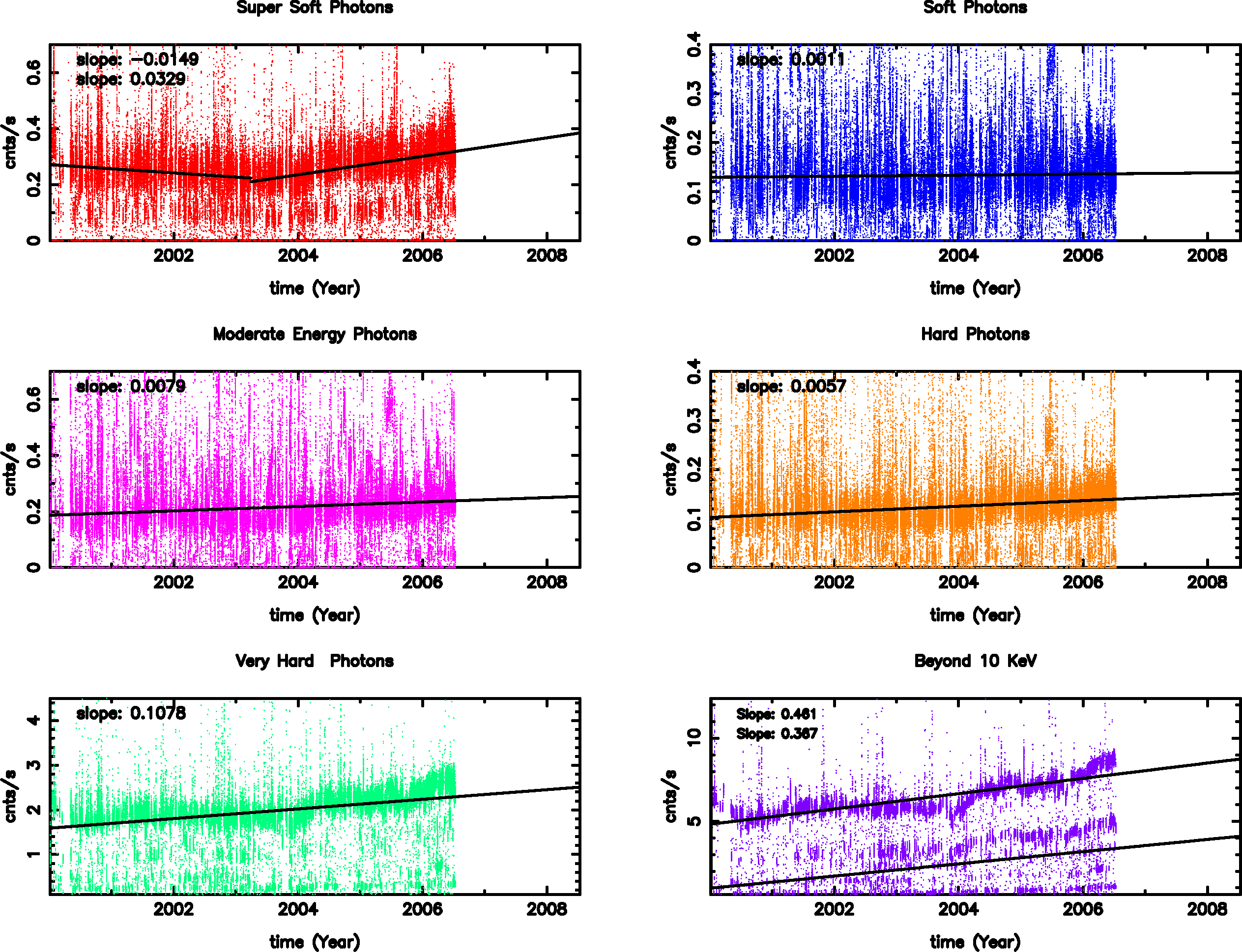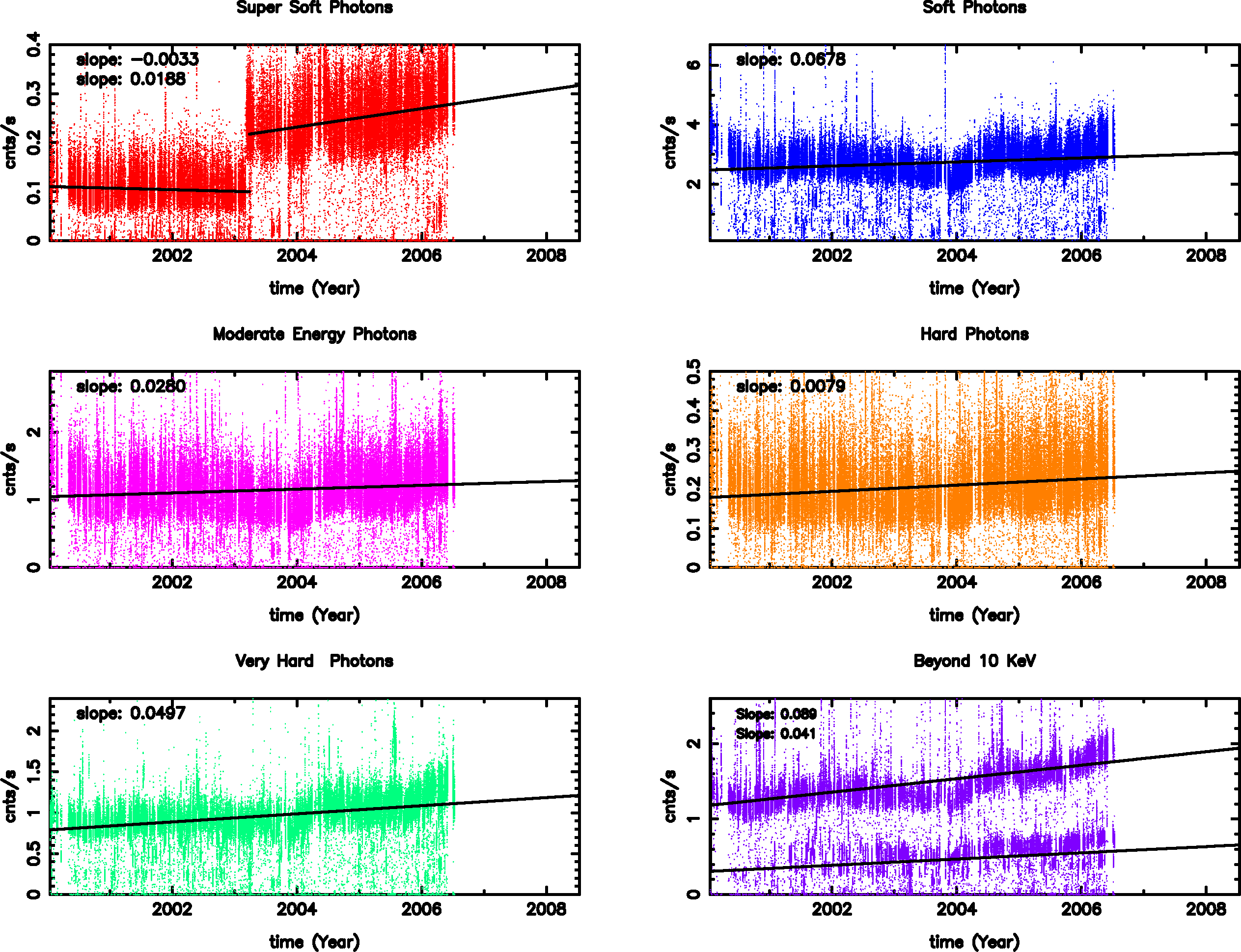 Statistics: # IMAGE NPIX MEAN RMS MIN MAX ACIS_jun06 6004901 9.492 13.731 0.0 744.0 I2 node 0 262654 8.709152 3.484109 0.0 46.0 I2 node 1 262654 9.253902 3.797511 0.0 305.0 I2 node 2 262654 9.123474 3.513426 0.0 84.0 I2 node 3 262654 9.019923 3.747867 0.0 55.0 I3 node 0 262654 9.067619 4.023481 0.0 53.0 I3 node 1 262654 9.309219 8.668181 0.0 203.0 I3 node 2 262654 8.517753 3.390050 0.0 51.0 I3 node 3 262654 8.555233 3.535884 0.0 170.0 S2 node 0 262654 12.155959 4.070865 0.0 59.0 S2 node 1 262654 12.542266 4.731537 0.0 75.0 S2 node 2 262654 13.671082 4.354496 0.0 113.0 S2 node 3 262654 14.113882 4.106979 1.0 327.0 S3 node 0 262654 19.491023 9.215208 1.0 109.0 S3 node 1 262654 20.631680 9.710757 0.0 209.0 S3 node 2 262654 19.319857 4.869215 3.0 470.0 S3 node 3 262654 17.017379 4.489780 2.0 288.0