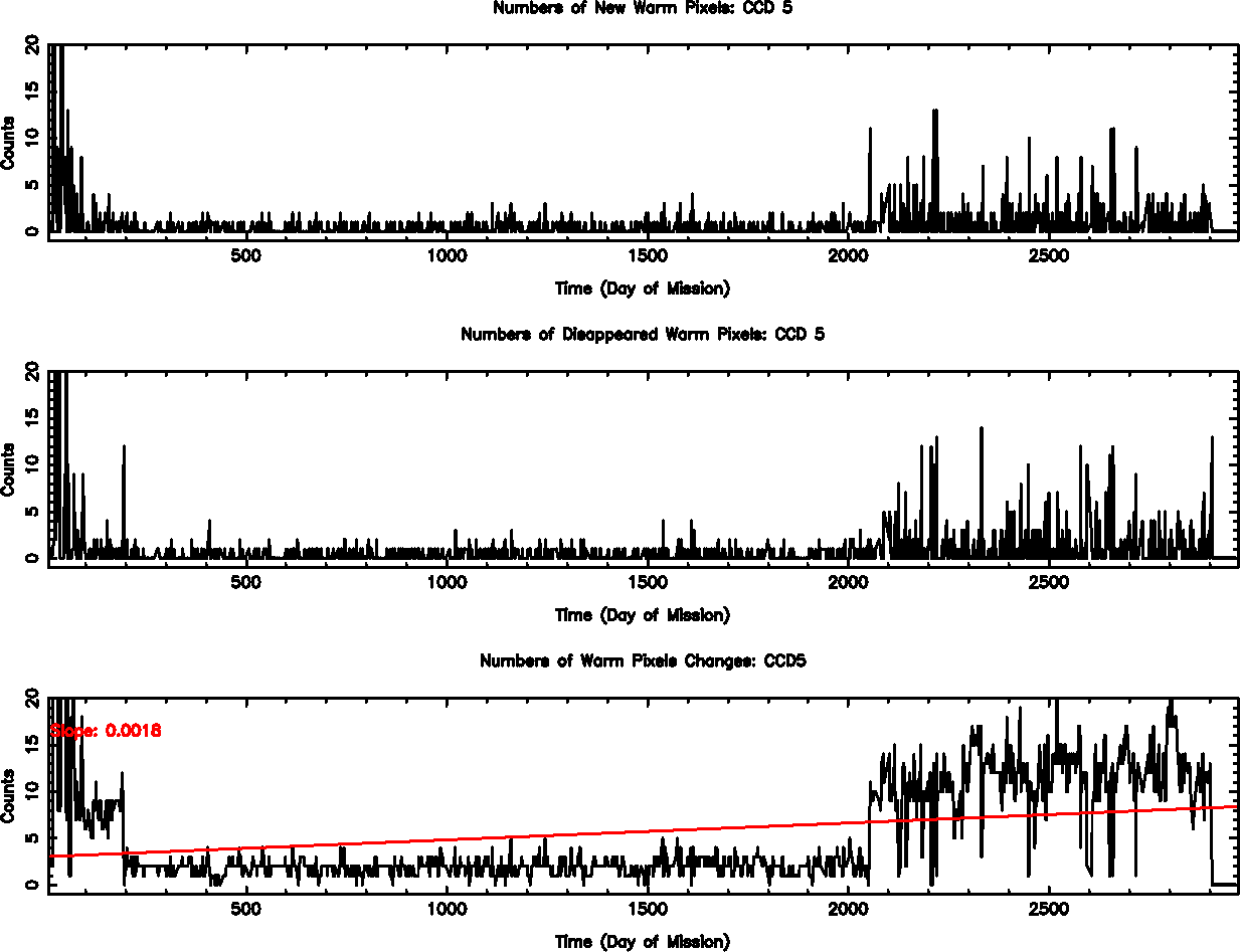 The plots below were generated with a new warm pixel finding script. Please see Acis Bad Pixel Page for details.