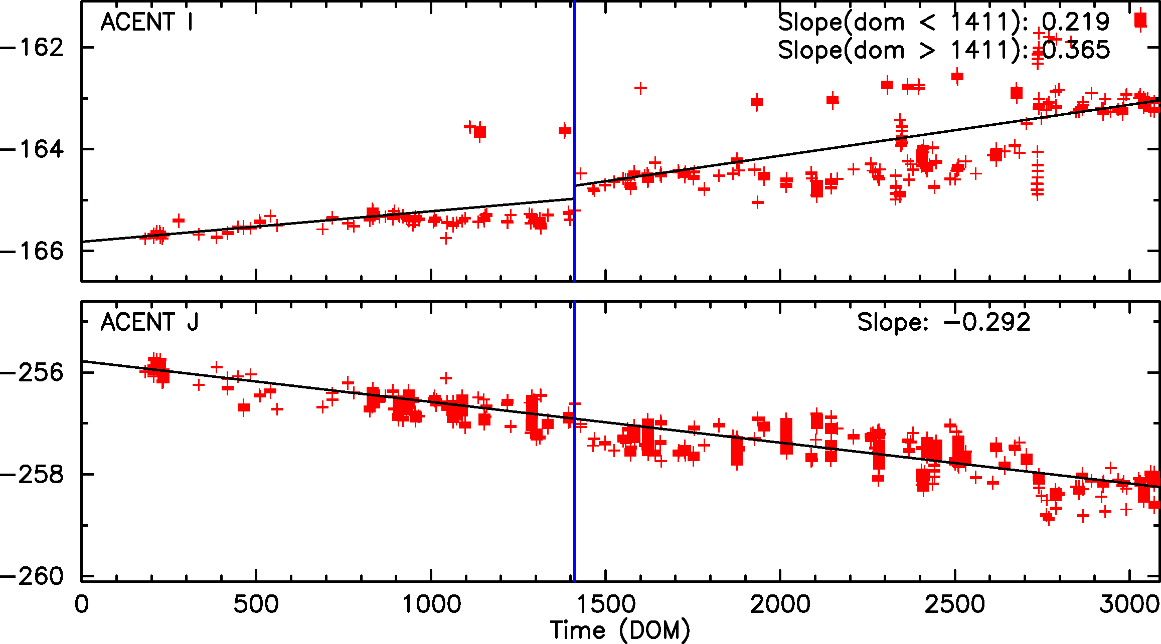 the change in a position per year (arcsec/yr). The vertical line on DOM = 1411 (September 1, 2003)