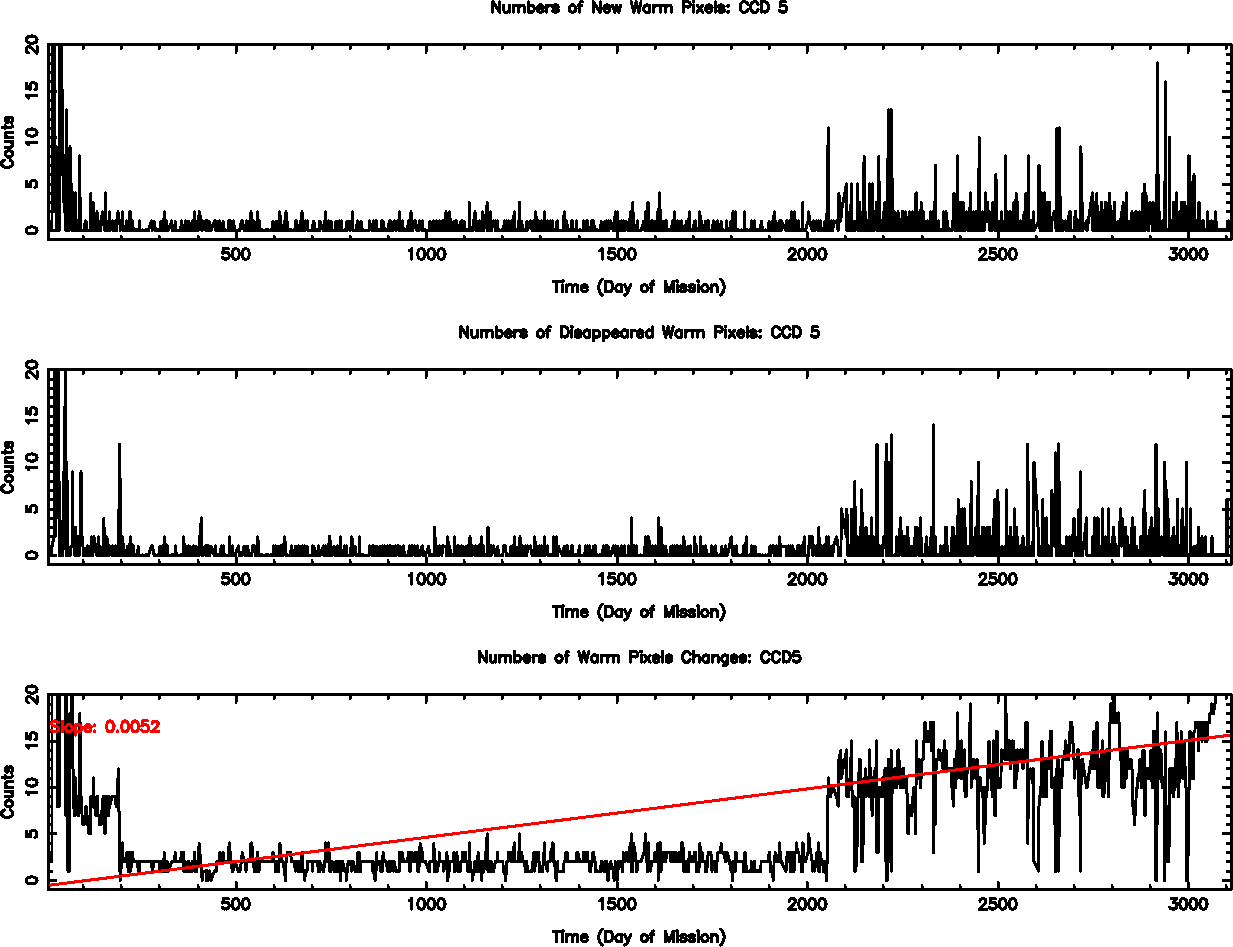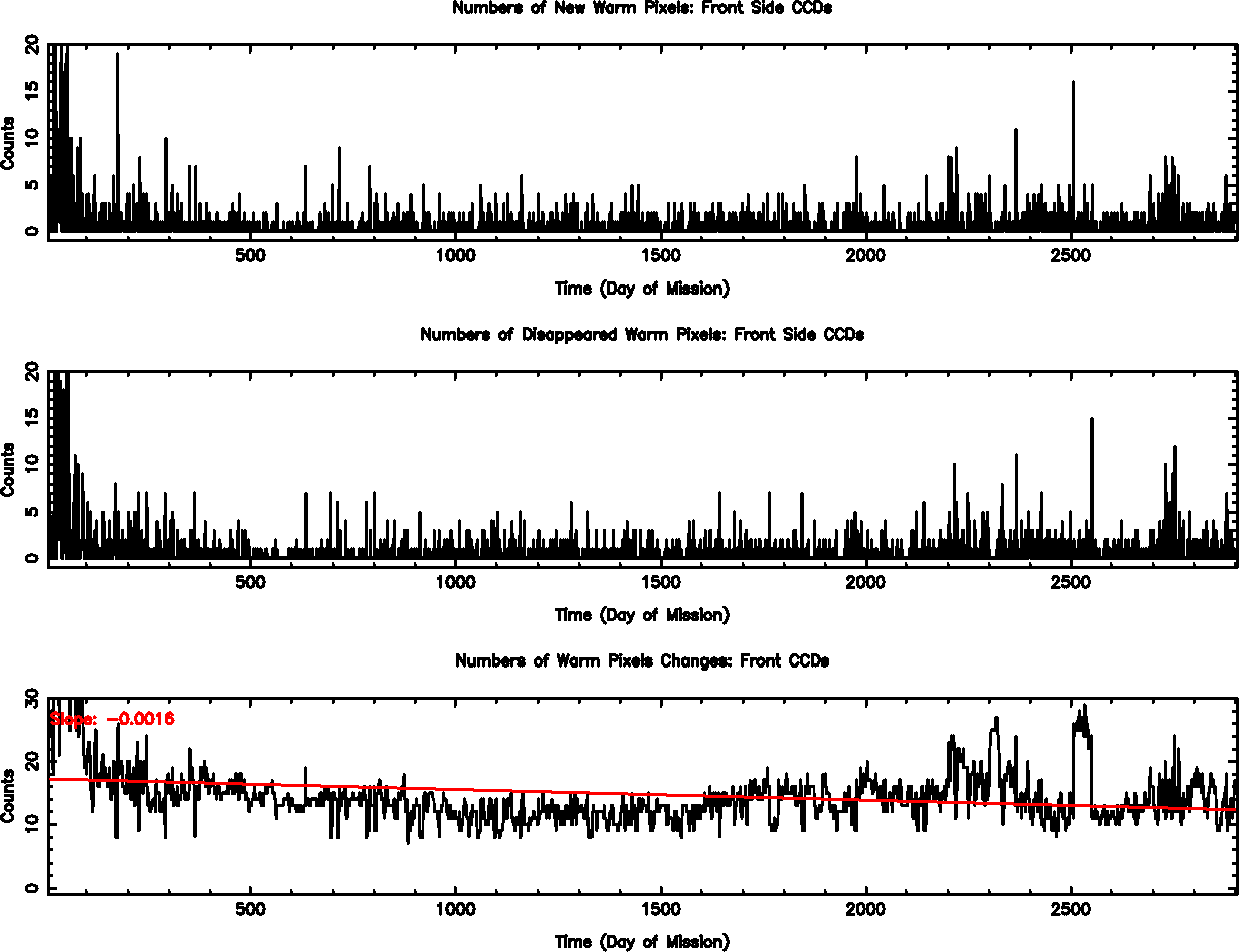 The plots below were generated with a new warm pixel finding script. Please see Acis Bad Pixel Page for details.