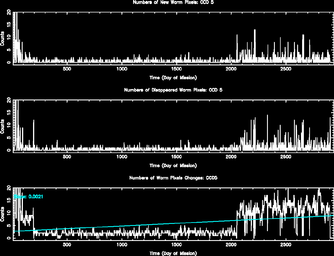 The plots below were generated with a new warm pixel finding script. Please see Acis Bad Pixel Page for details.