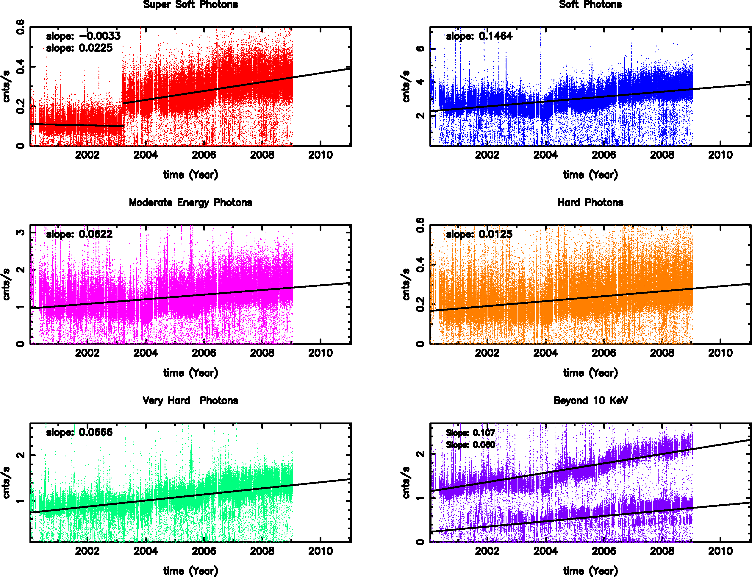 The following three plots show trends of SIB from year 2000. CCDs shown here are CCD3, CCD5, and CCD7. Fitted lines are linear fit after eliminating extreme outliers. For >10 keV plots, 2 lines are fit. One is with a 13 keV filter, and another without.