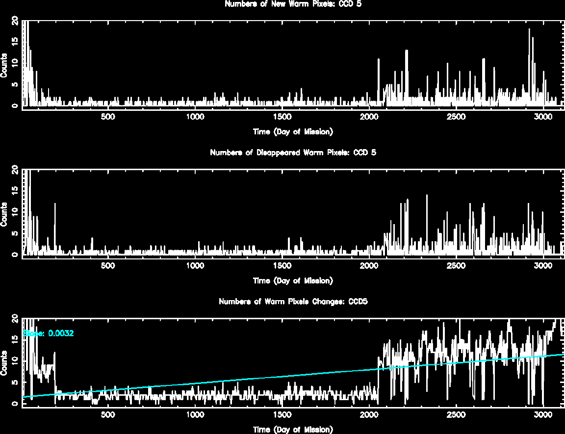 The plots below were generated with a new warm pixel finding script. Please see Acis Bad Pixel Page for details.