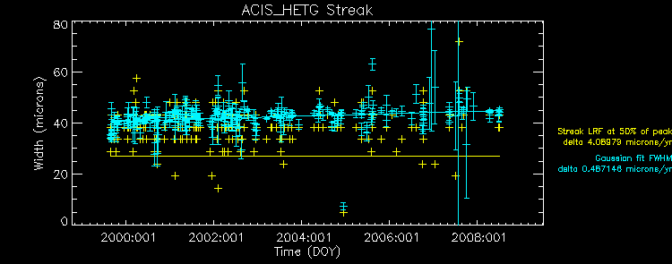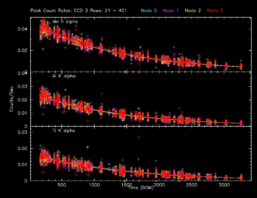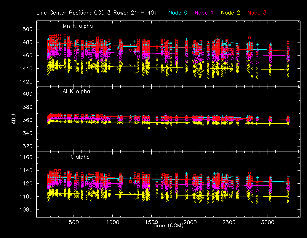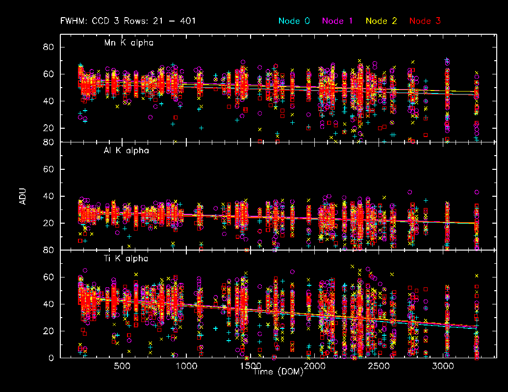 We collected data from acis histogram mode data, and created trend plots of peak portions and peak widths against time (DOM). The peaks were estimated by fitting a simple Gaussian on three peaks (Al, Ti, and Mn), and the widths were estimated by a width at the half max from the peak.