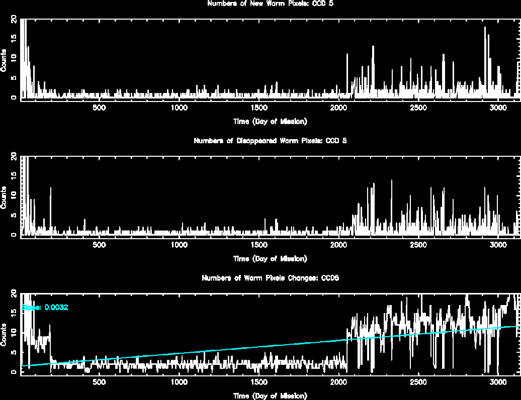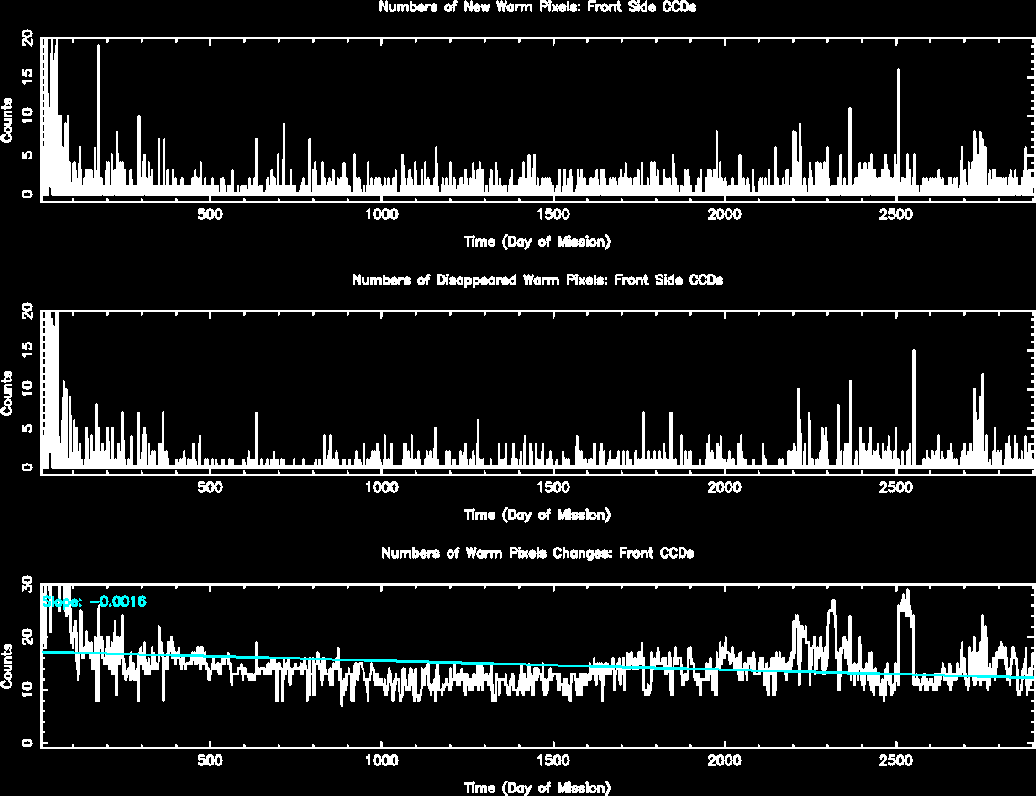 The plots below were generated with a new warm pixel finding script. Please see Acis Bad Pixel Page for details.