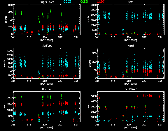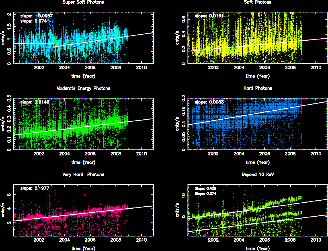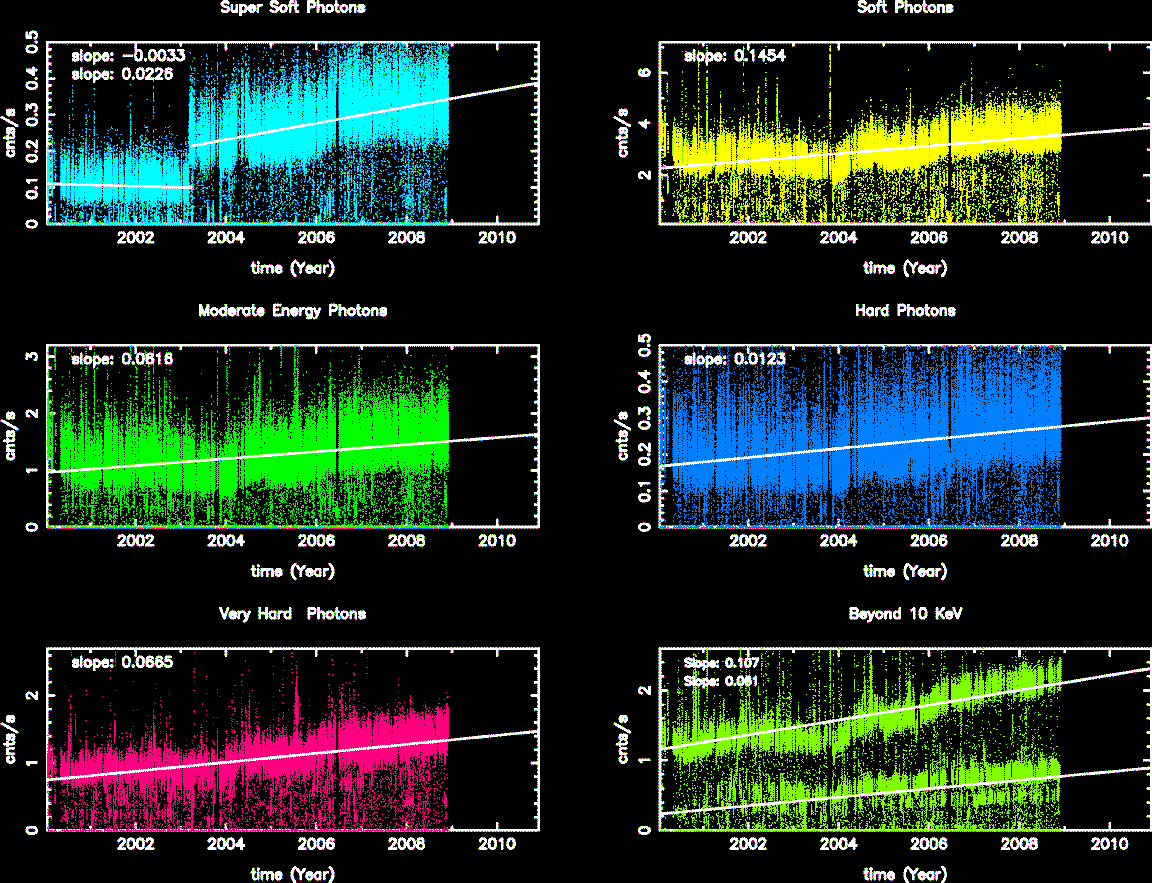 Statistics: # IMAGE NPIX MEAN RMS MIN MAX ACIS_nov08 6004901 9.129 12.66 0.0 826.0 I2 node 0 262654 7.533611 3.203536 0.0 32.0 I2 node 1 262654 8.030657 3.521326 0.0 176.0 I2 node 2 262654 7.962688 3.269163 0.0 37.0 I2 node 3 262654 7.907738 3.454434 0.0 44.0 I3 node 0 262654 7.663861 3.201097 0.0 37.0 I3 node 1 262654 8.153996 7.598823 0.0 182.0 I3 node 2 262654 7.459794 3.088459 0.0 55.0 I3 node 3 262654 7.426491 3.130643 0.0 113.0 I2 node 0 262654 13.714805 4.904197 0.0 169.0 I2 node 1 262654 13.910399 5.635959 0.0 98.0 I2 node 2 262654 14.527191 5.379210 0.0 114.0 I2 node 3 262654 13.733786 5.053378 0.0 826.0 I3 node 0 262654 18.018375 11.582354 1.0 334.0 I3 node 1 262654 18.547942 6.661727 0.0 104.0 I3 node 2 262654 18.347595 6.205826 0.0 55.0 I3 node 3 262654 17.164212 6.021551 0.0 85.0