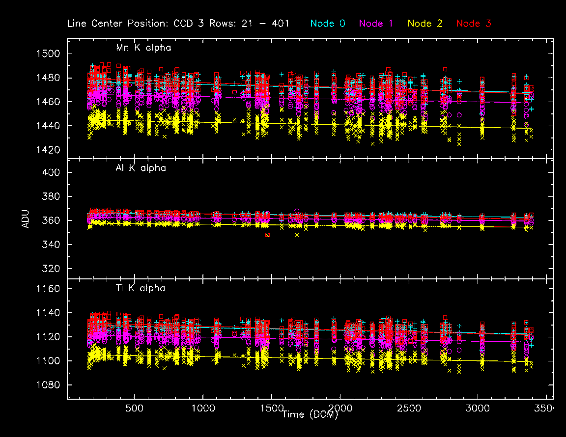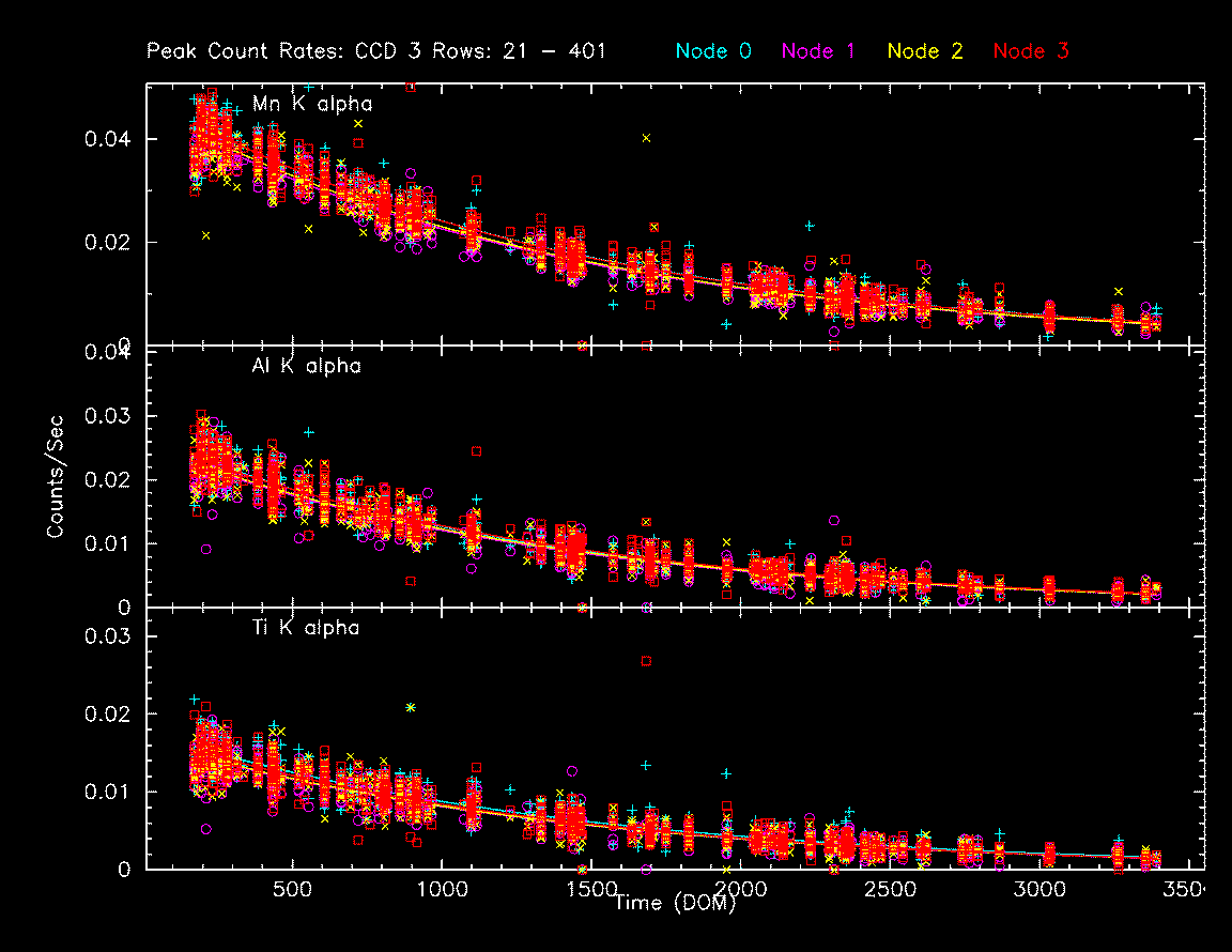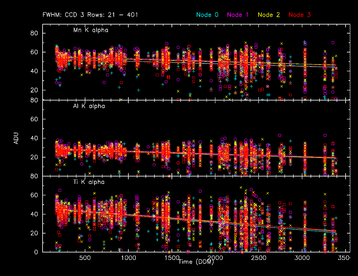 We collected data from acis histogram mode data, and created trend plots of peak portions and peak widths against time (DOM). The peaks were estimated by fitting a simple Gaussian on three peaks (Al, Ti, and Mn), and the widths were estimated by a width at the half max from the peak.