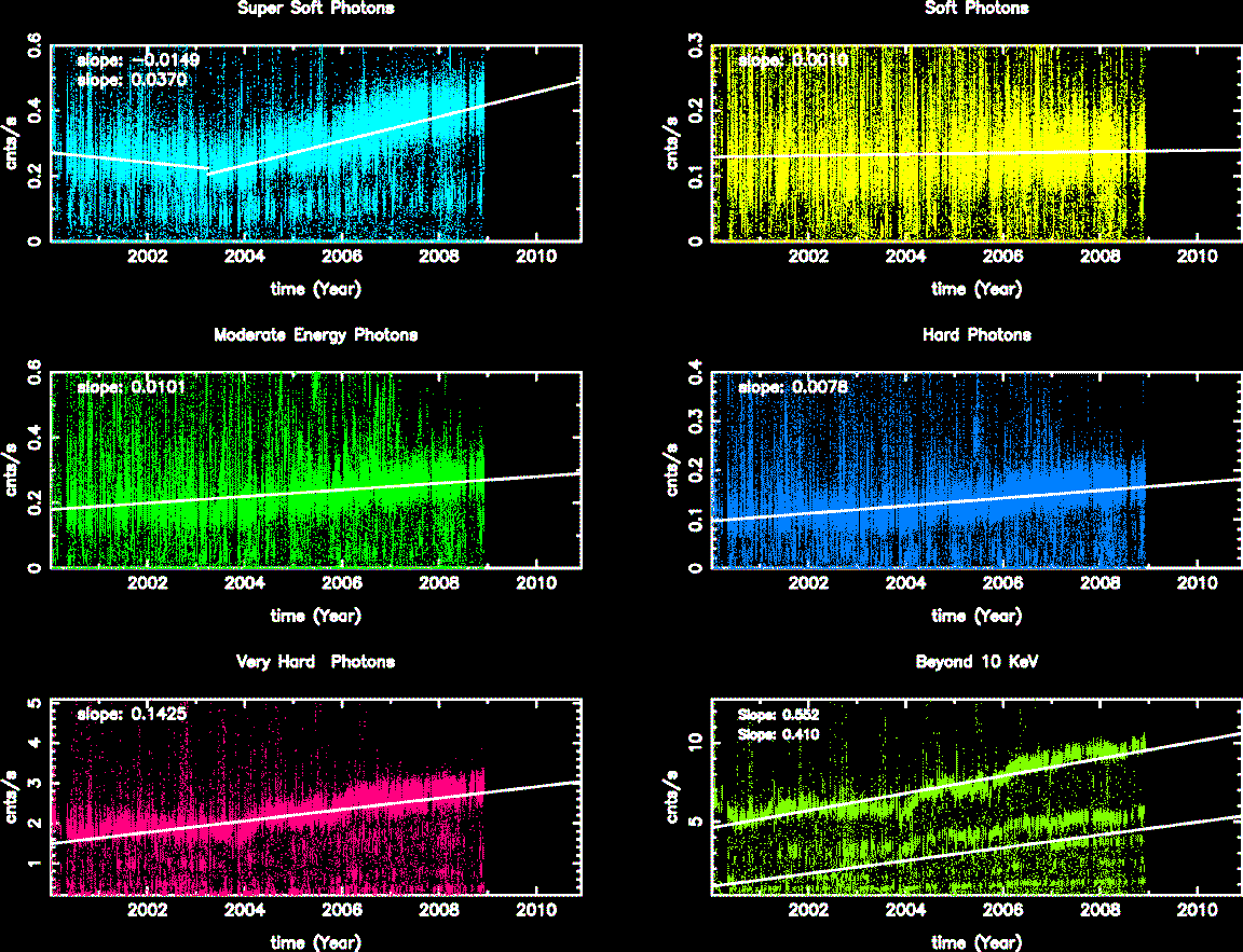 Statistics: IMAGE NPIX MEAN RMS MIN MAX ACIS_total 6004901 1202.65 1645.70 0.0 73242.0 I2 node 0 262654 929.059097 166.867604 0.0 4193.0 I2 node 1 262654 982.629960 228.039823 0.0 15650.0 I2 node 2 262654 997.247360 192.397576 0.0 8371.0 I2 node 3 262654 998.758588 244.650123 0.0 27238.0 I3 node 0 262654 1050.962356 254.396910 0.0 5554.0 I3 node 1 262654 1090.911659 785.268128 0.0 20797.0 I3 node 2 262654 970.165171 165.487077 0.0 4166.0 I3 node 3 262654 958.427925 177.781943 0.0 17780.0 I2 node 0 262654 1435.878454 187.391333 707.0 19783.0 I2 node 1 262654 1522.566402 311.689135 735.0 7924.0 I2 node 2 262654 1698.732280 317.927392 957.0 11228.0 I2 node 3 262654 1642.005695 239.141397 937.0 21685.0 I3 node 0 262654 2534.006039 1280.150949 1025.0 10931.0 I3 node 1 262654 3746.325821 1786.510391 0.0 11842.0 I3 node 2 262654 2746.148641 811.364748 910.0 6194.0 I3 node 3 262654 2063.759882 332.889709 1082.0 8178.0