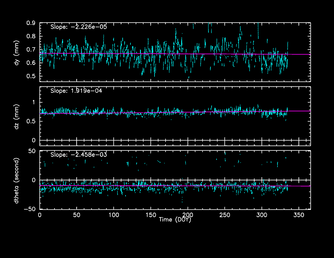 SIM Shift and Twist Trend The following plots show trends of SIM shifts (dy and dz) and twist (dtheta). All quantities are directly taken from pcaf*_asol1.fits files. The units are mm for dy and dz, and degree for dtheta. We fit three lines separated before and after (Days of Mission)= 1400 (May 21, 2003), and 2700 (Jan 11, 2006). The unit of slopes are mm per day or degree per day.