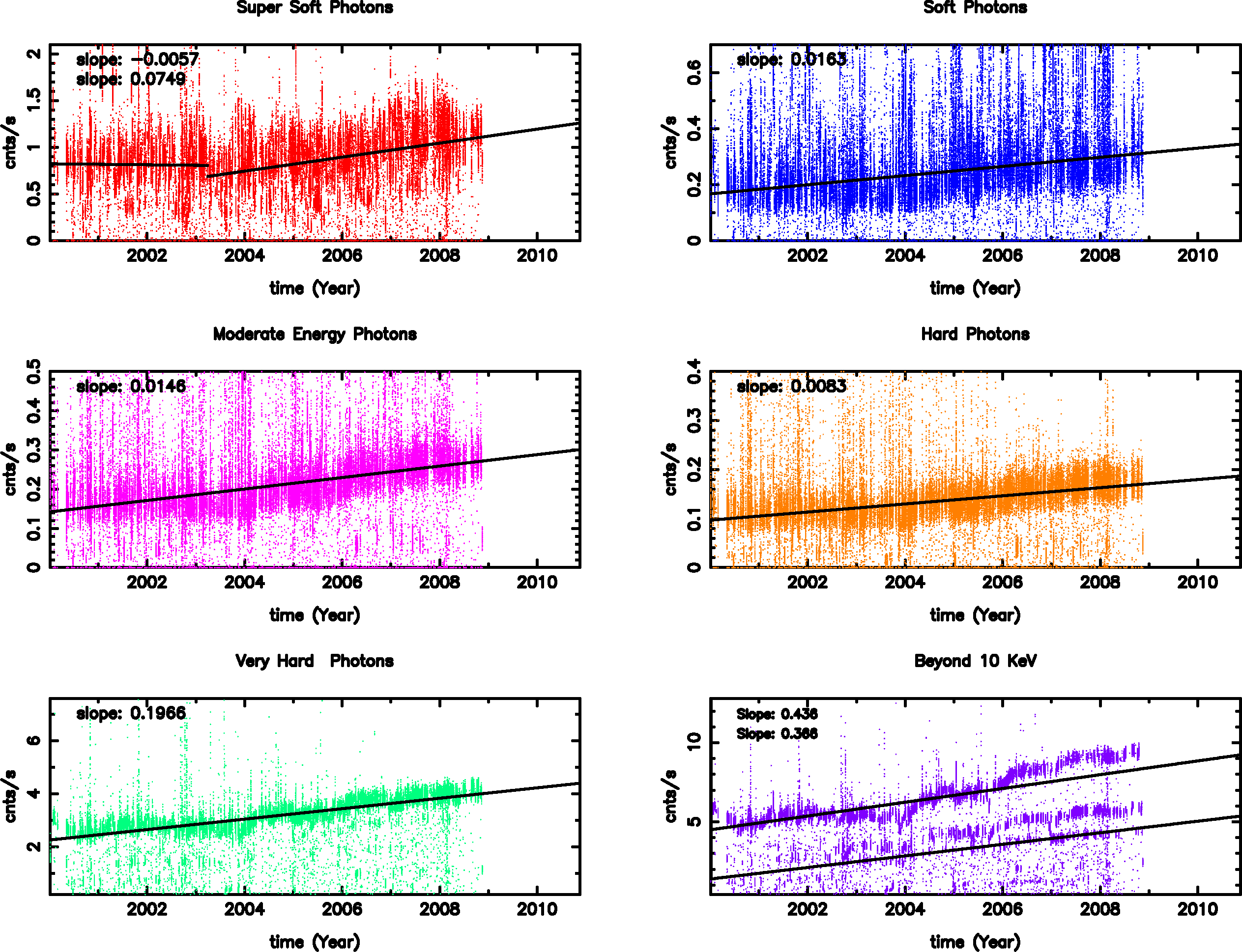 outliers. For >10 keV plots, 2 lines are fit. One is with a 13 keV filter, and