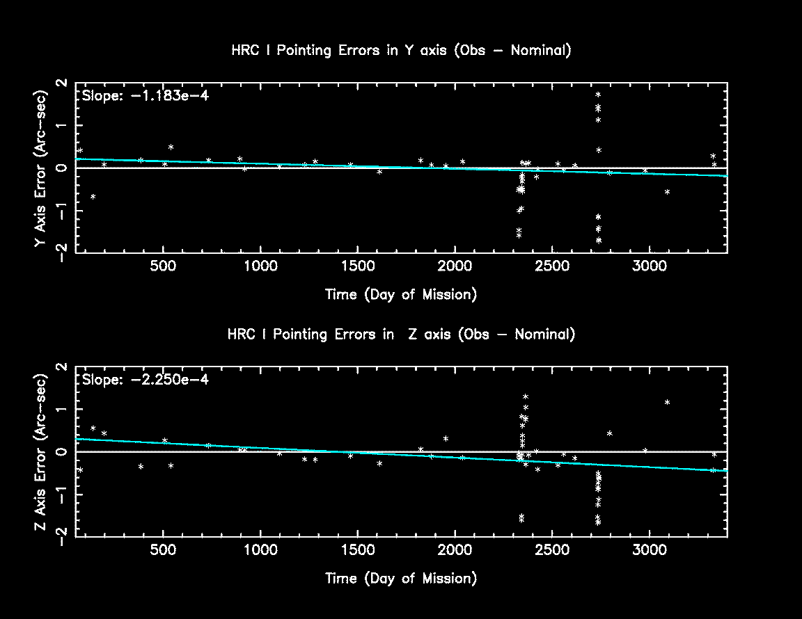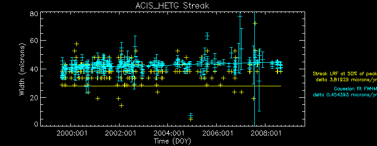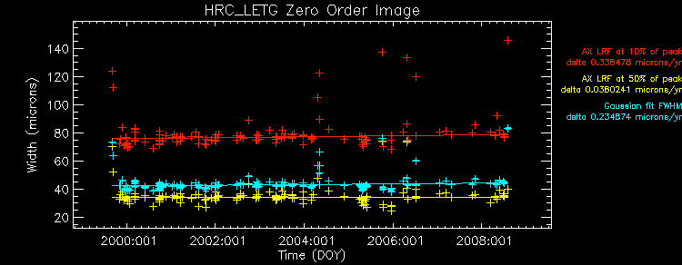 The large dispersion around DOM ~ 2400 (Jan 2005) are all due to none grating Capella observations. Many observations are off-axis observations (e.g., obsid 6558).