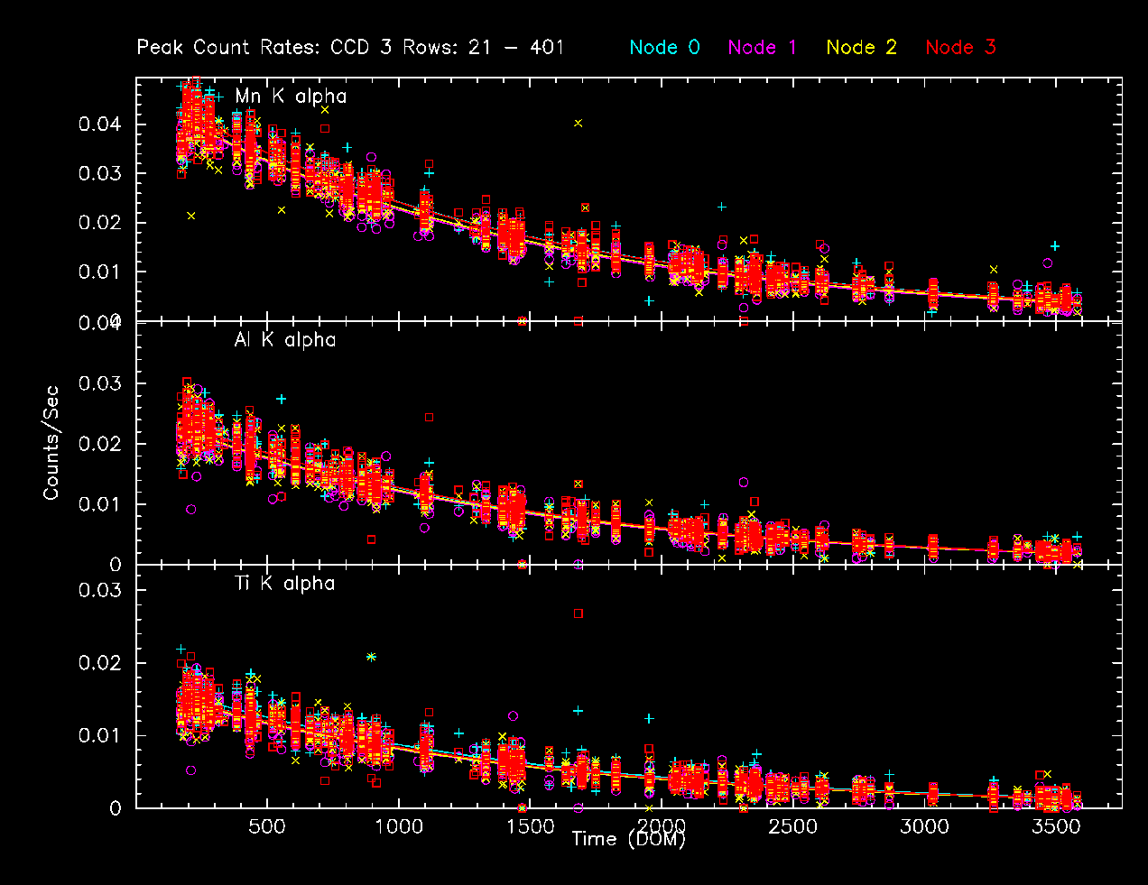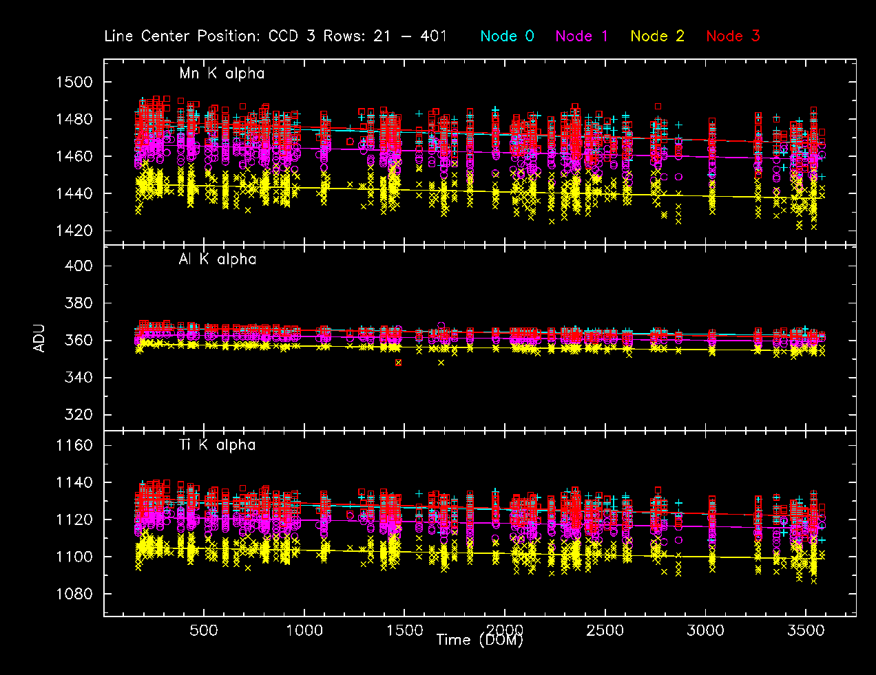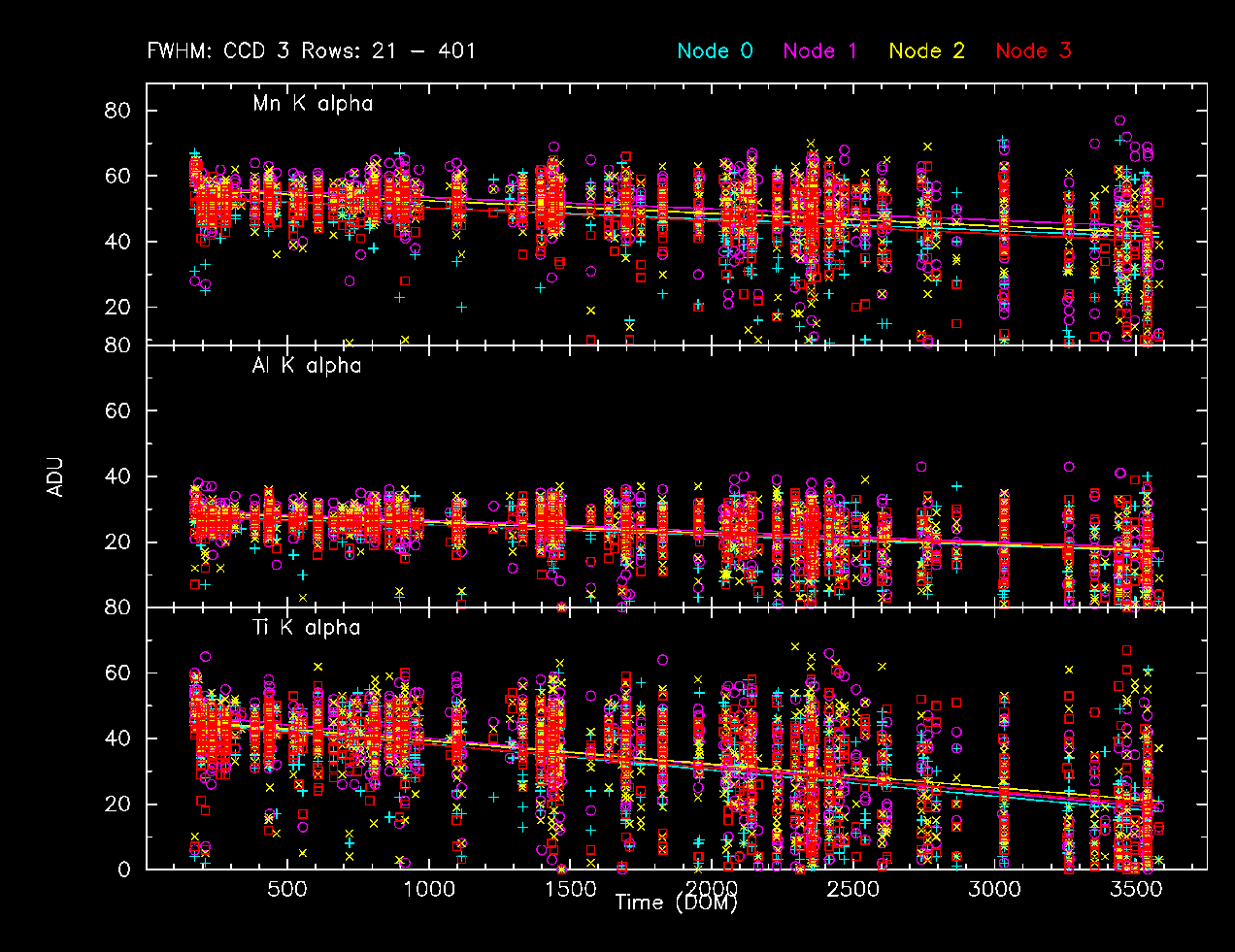 We collected data from acis histogram mode data, and created trend plots of peak portions and peak widths against time (DOM). The peaks were estimated by fitting a simple Gaussian on three peaks (Al, Ti, and Mn), and the widths were estimated by a width at the half max from the peak.
