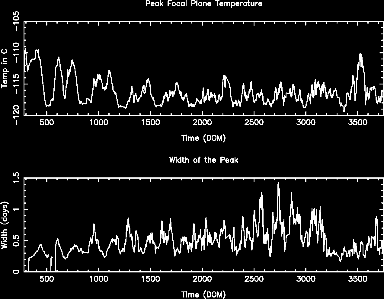 We are using 10 period moving averages to show trends of peak temperatures and peak widths. Note, the gaps in the width plot are due to missing/corrupted data.