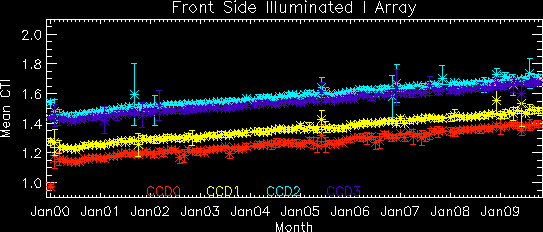 We report CTIs with a refined data definition. CTIs were computed for the temperature dependency corrected data. Please see CTI page for detailed explanation. CTI's are computed for Mn K alpha, and defined as slope/intercept x10^4 of row # vs ADU. Data file: here