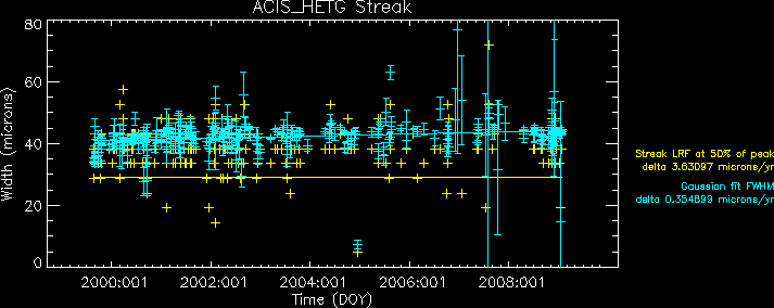 We plot the width of the zero order streak of ACIS/HETG observations and the width of the zero order image for HRC/LETG observations of point sources. No significant defocusing trend is seen at this time. See Gratings Focus pages. (NOTE: the figures are not updated from Mar 2009 due to a system problem.)