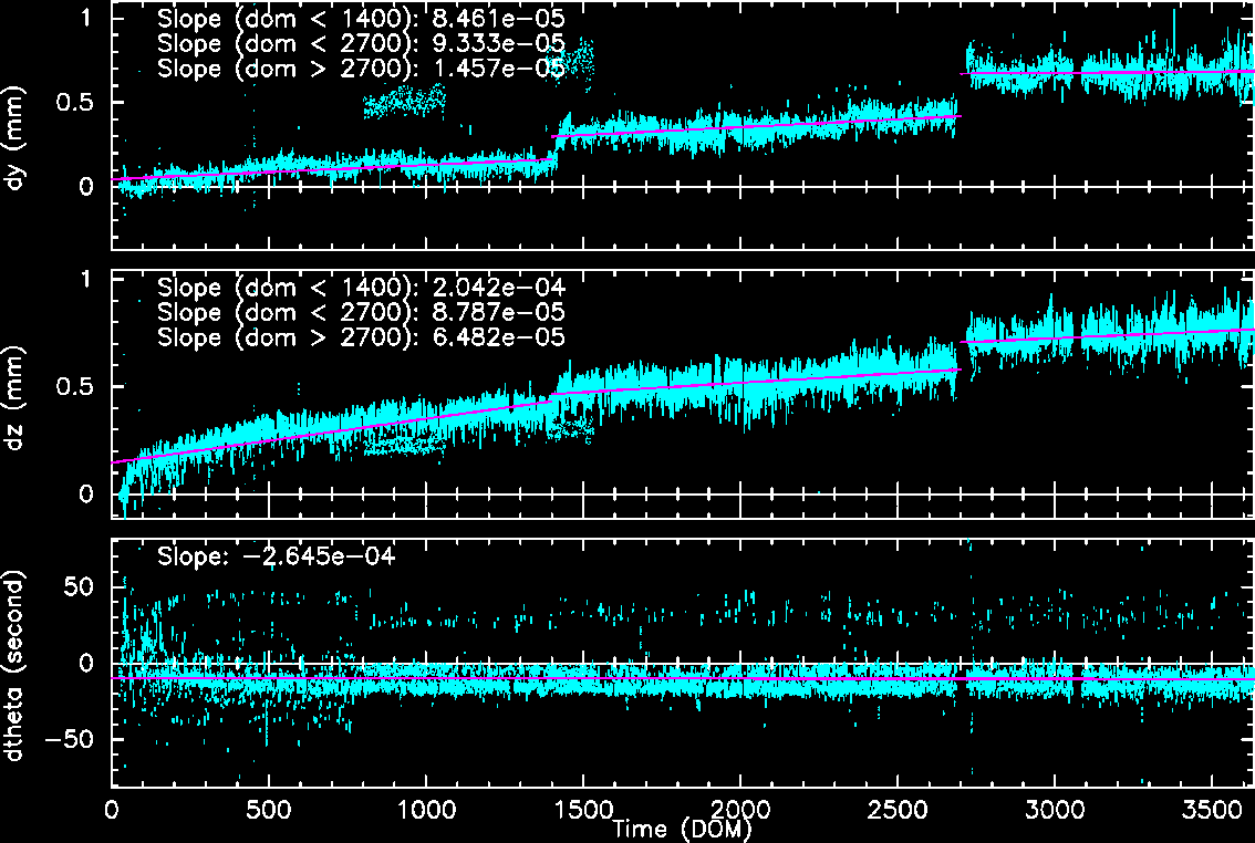 The sudden shift around DOM = 1400 and 2700 are due to fid light drift (see a memo by Aldcroft fiducial light drift). On the dtheta plot, two tracks are clearly observed. The track around 0.01 is due to HRC-I, and all others are clustered around -0.002. For more detail, please see SIM Shift and Twist Trend page