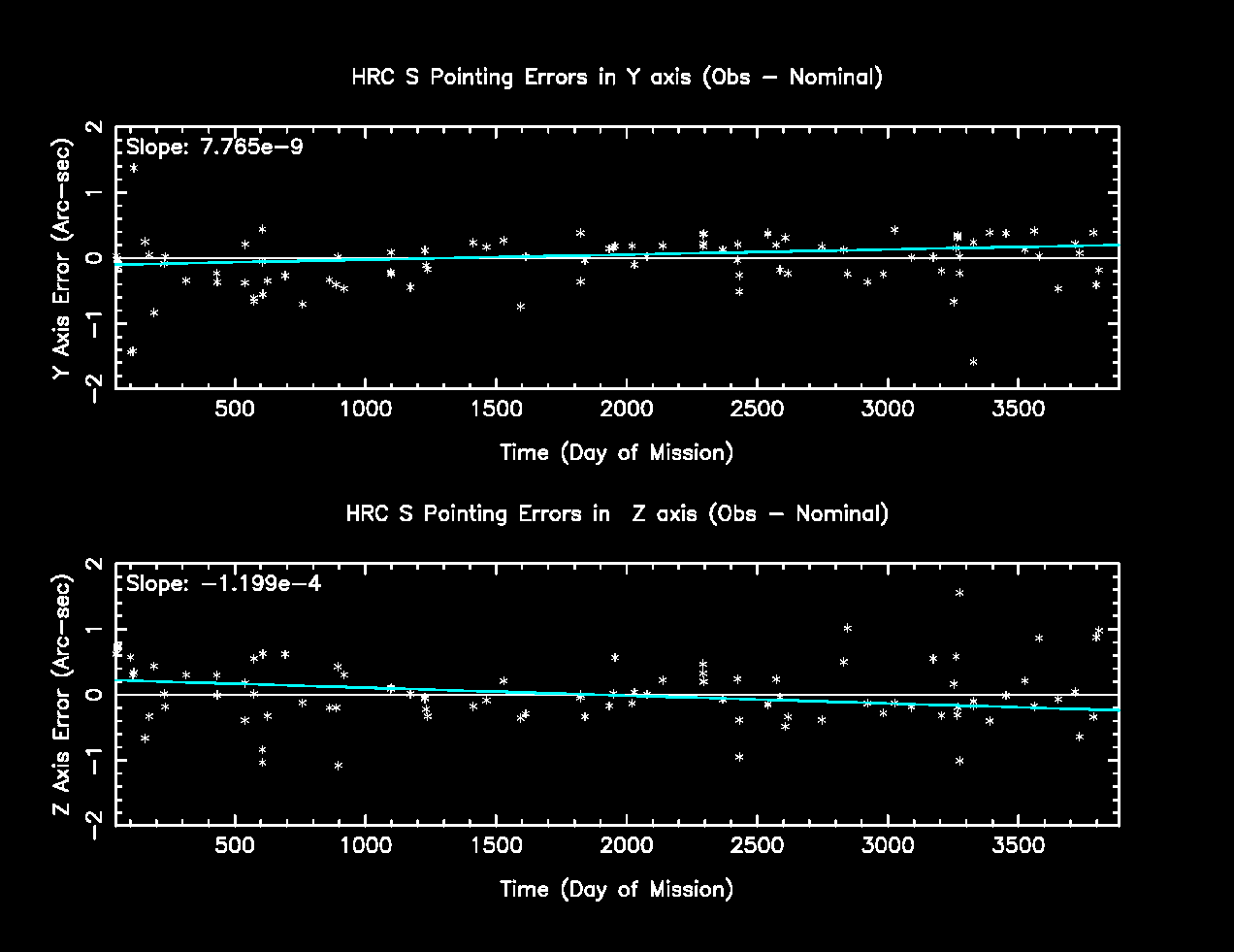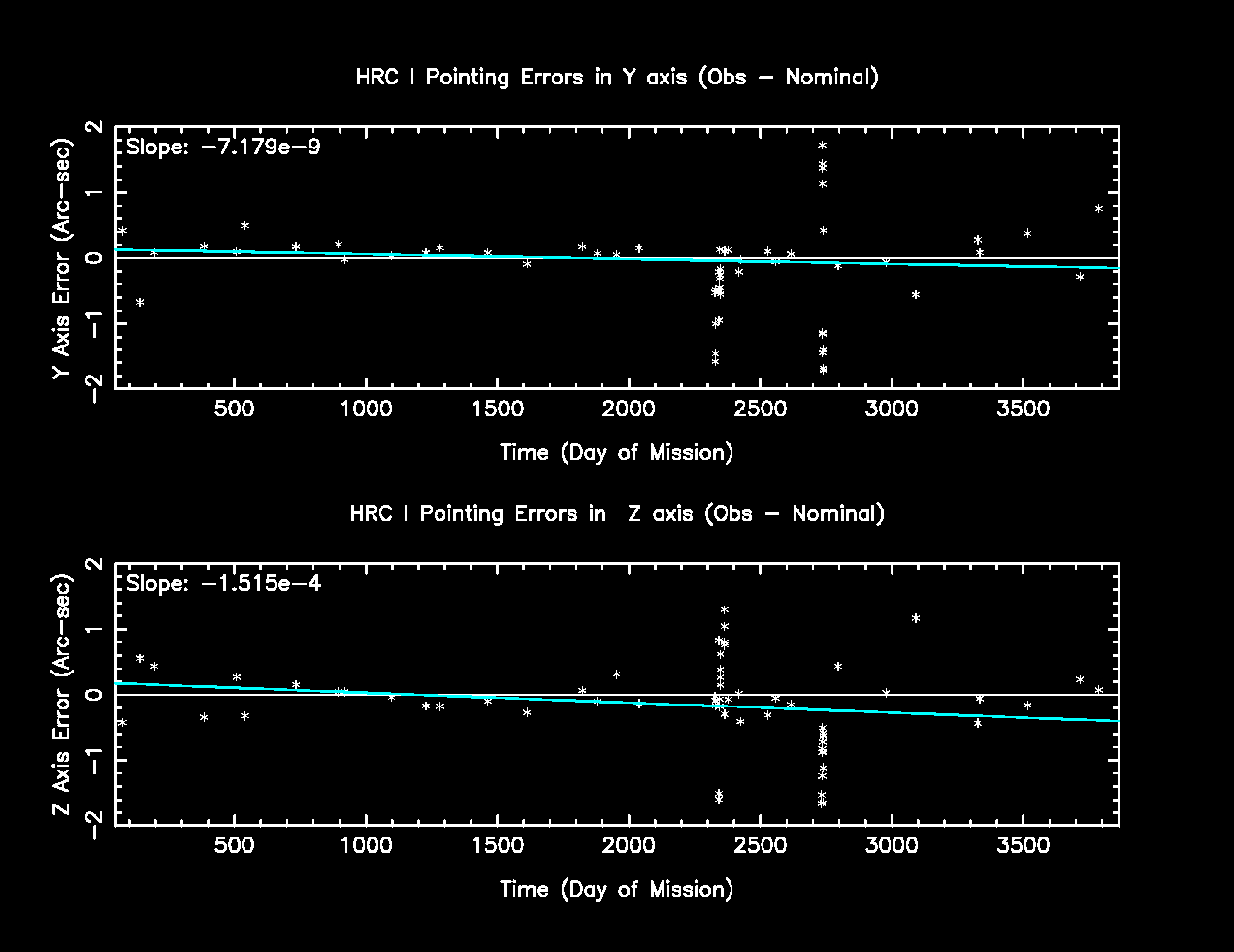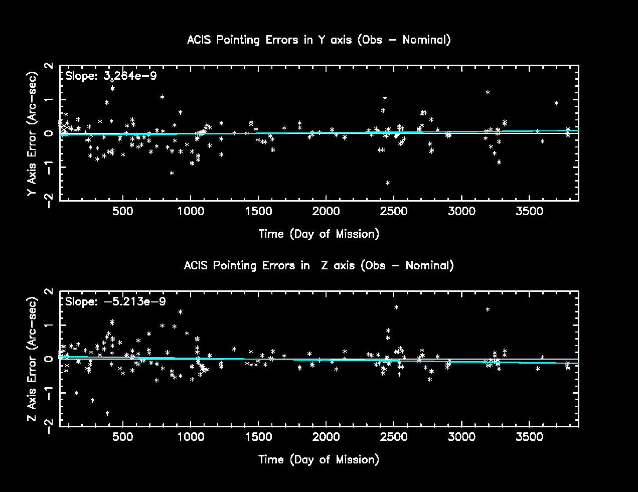 The following plots are the difference between coordinates obtained from Chandra observations and those obtained from existing catalogs vs time in day of mission.