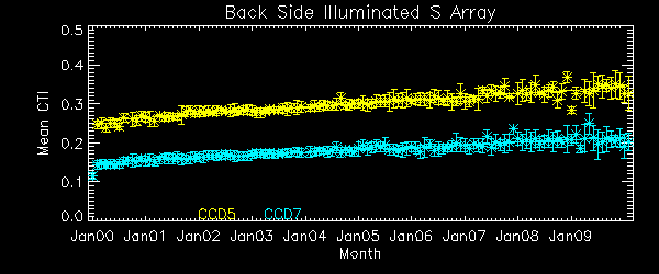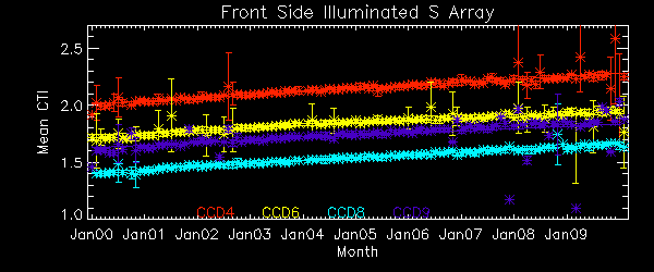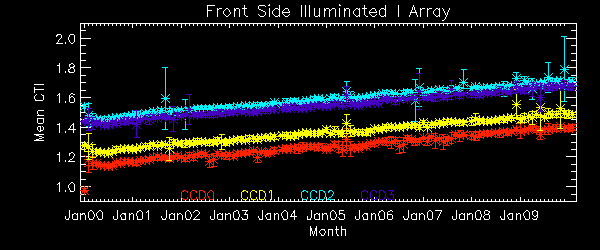 We report CTIs with a refined data definition. CTIs were computed for the temperature dependency corrected data. Please see CTI page for detailed explanation. CTI's are computed for Mn K alpha, and defined as slope/intercept x10^4 of row # vs ADU. Data file: here