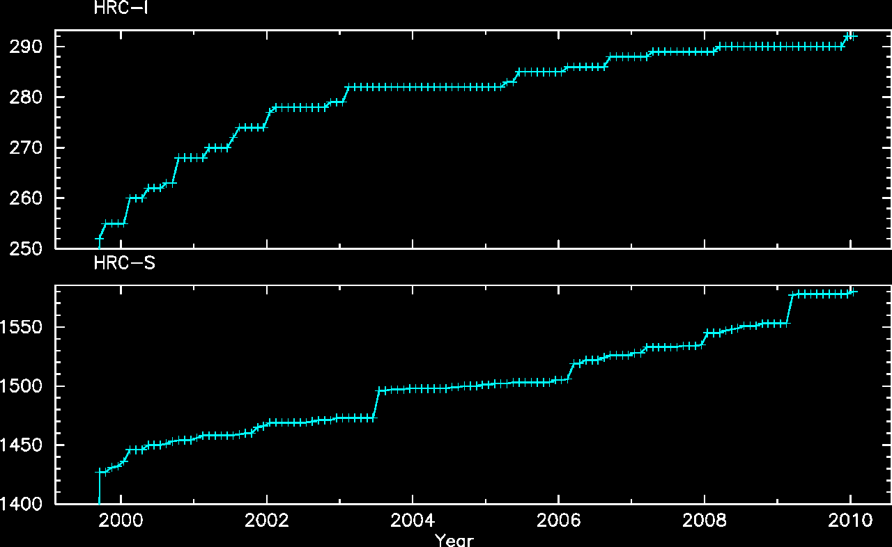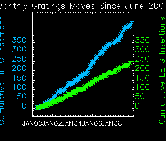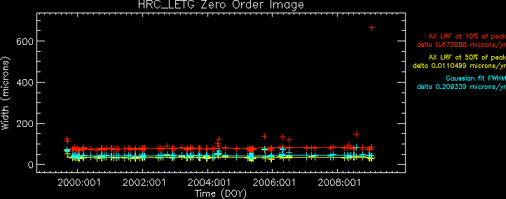 We plot the width of the zero order streak of ACIS/HETG observations and the width of the zero order image for HRC/LETG observations of point sources. No significant defocusing trend is seen at this time. See Gratings Focus pages. (NOTE: the figures are not updated from Mar 2009 due to a system problem.)