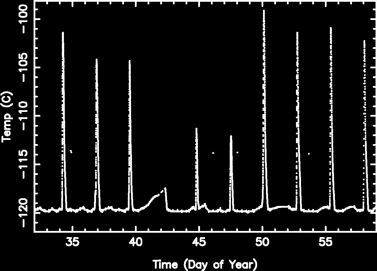 We are using 10 period moving averages to show trends of peak temperatures and peak widths. Note, the gaps in the width plot are due to missing/corrupted data.