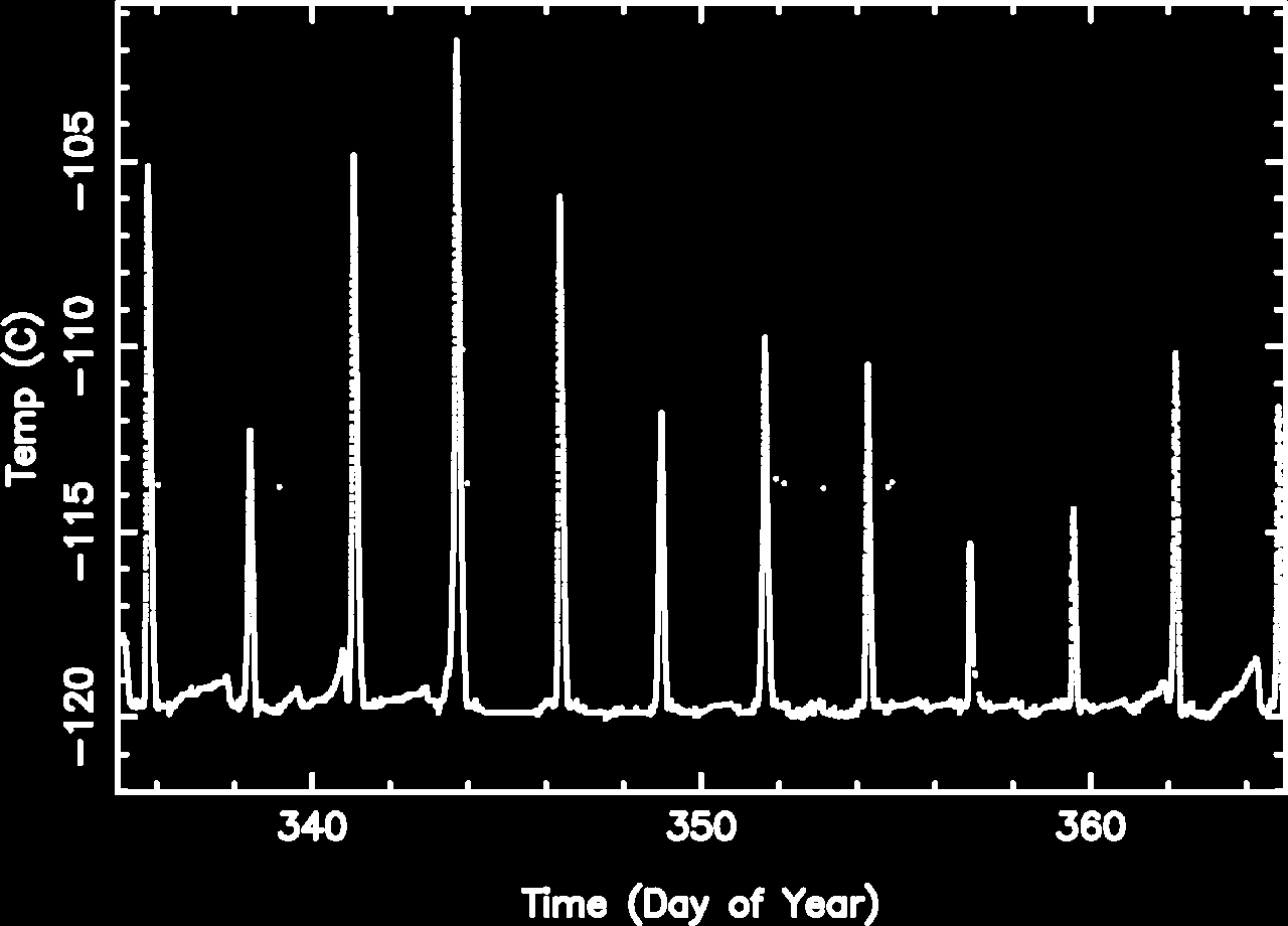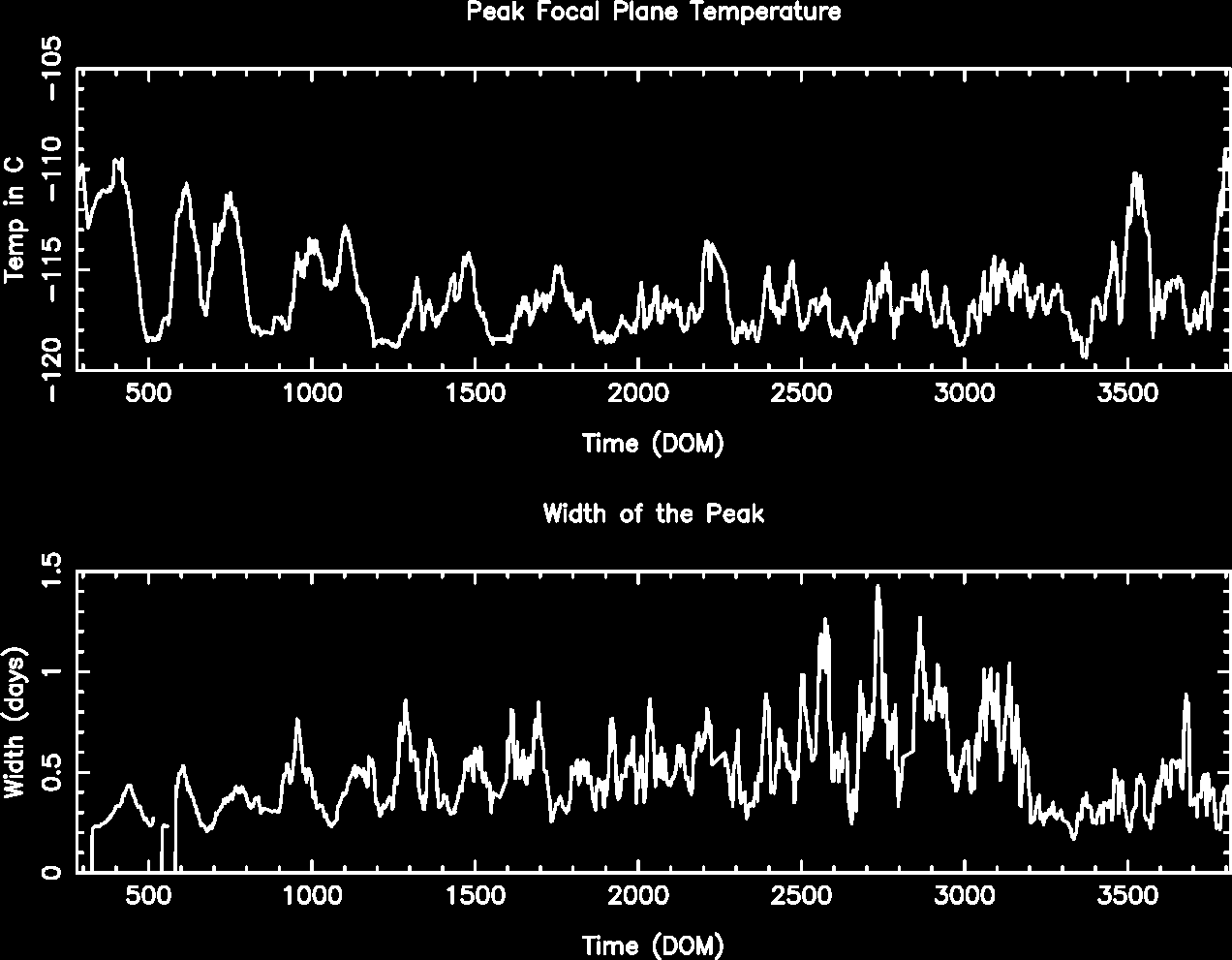 We are using 10 period moving averages to show trends of peak temperatures and peak widths. Note, the gaps in the width plot are due to missing/corrupted data.
