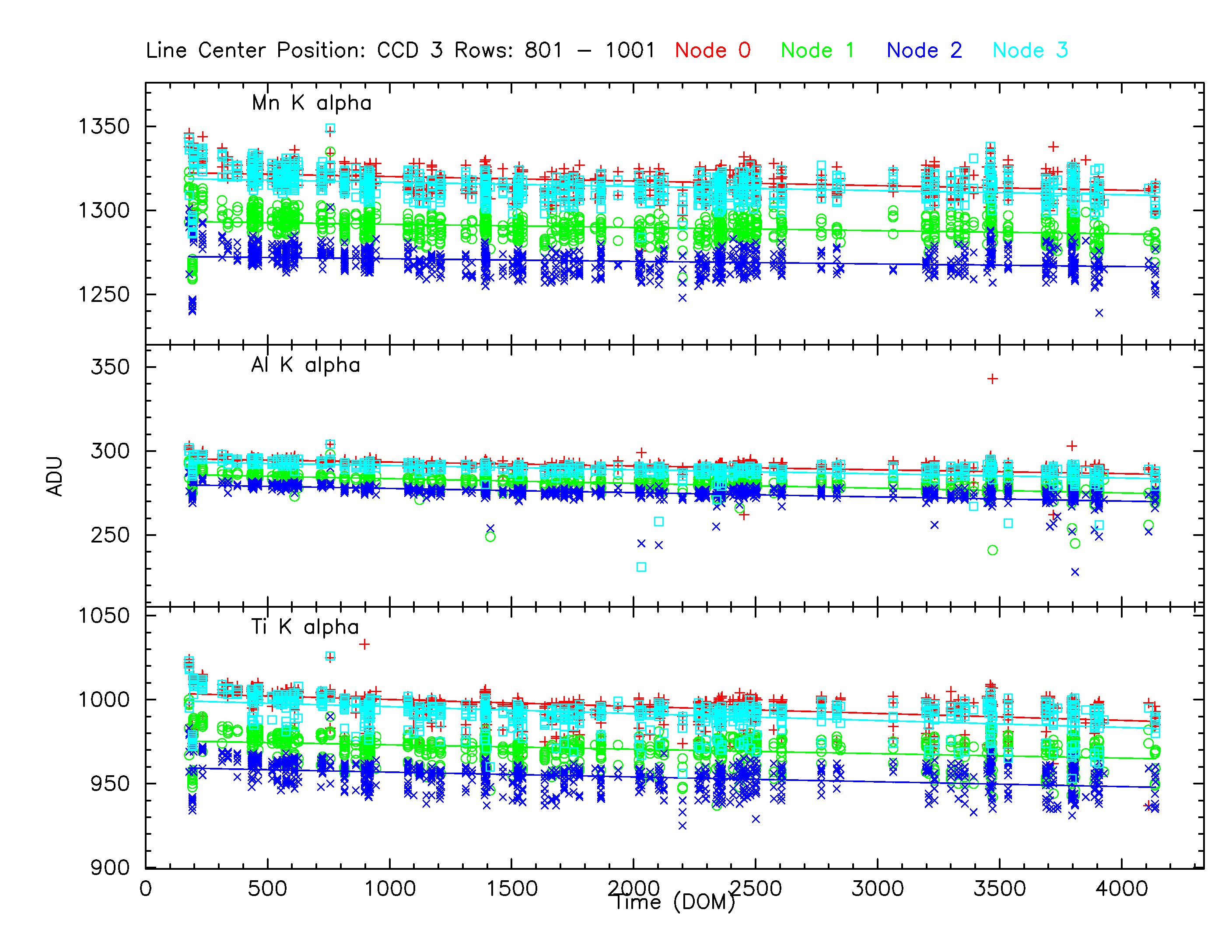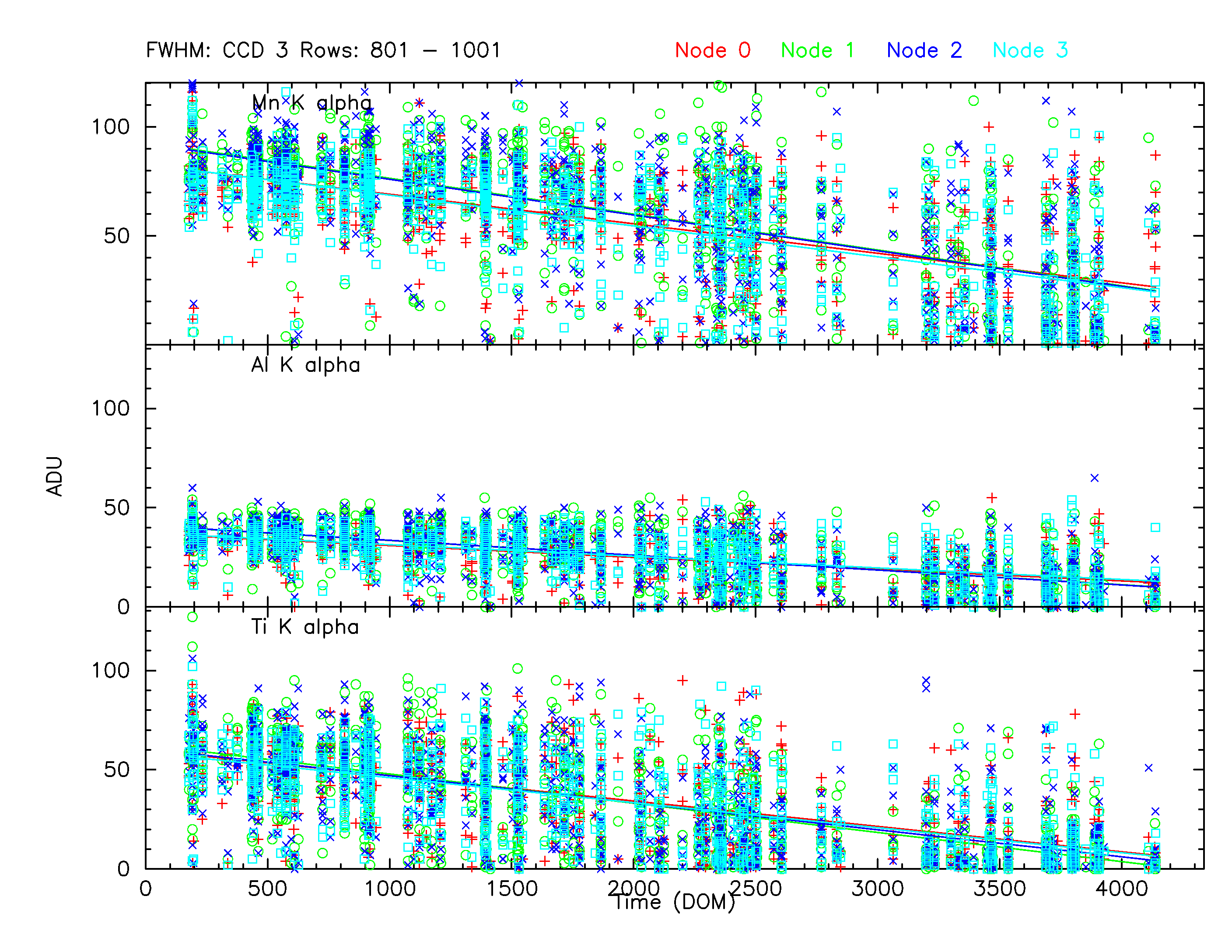 We collected data from acis histogram mode data, and created trend plots of peak portions and peak widths against time (DOM). The peaks were estimated by fitting a simple Gaussian on three peaks (Al, Ti, and Mn), and the widths were estimated by a width at the half max from the peak.