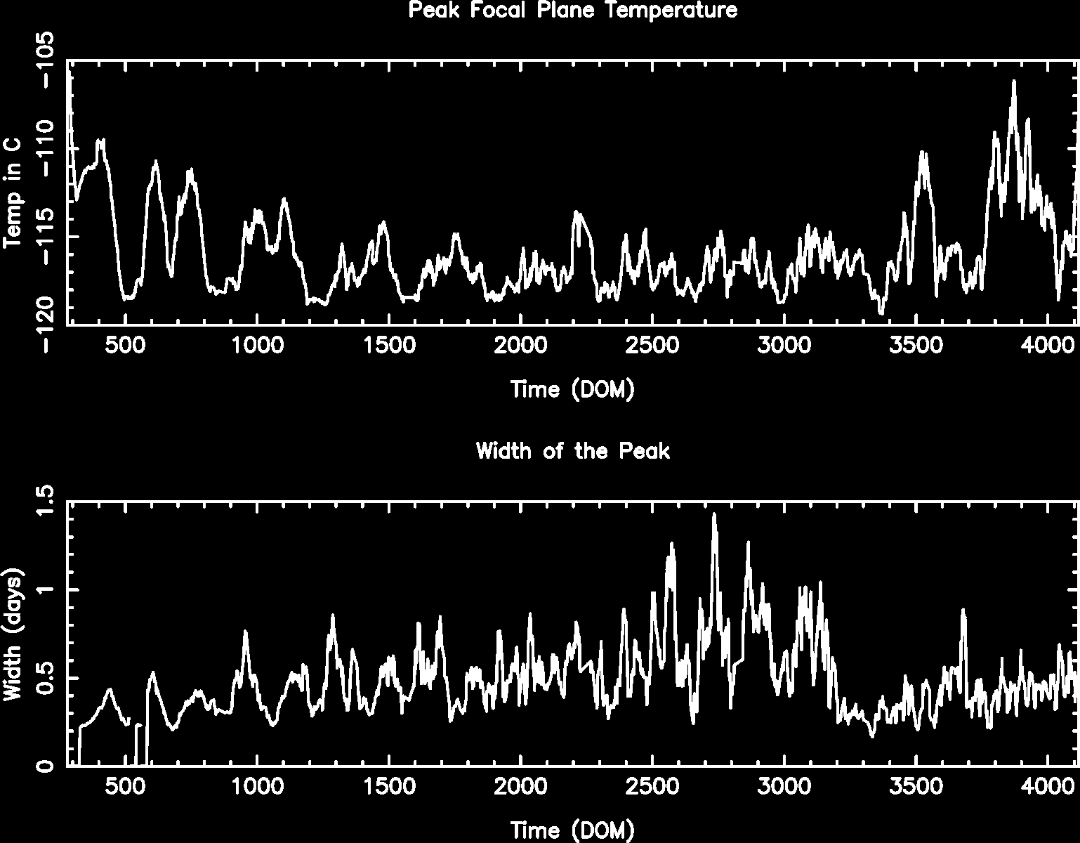 We are using 10 period moving averages to show trends of peak temperatures and peak widths. Note, the gaps in the width plot are due to missing/corrupted data.