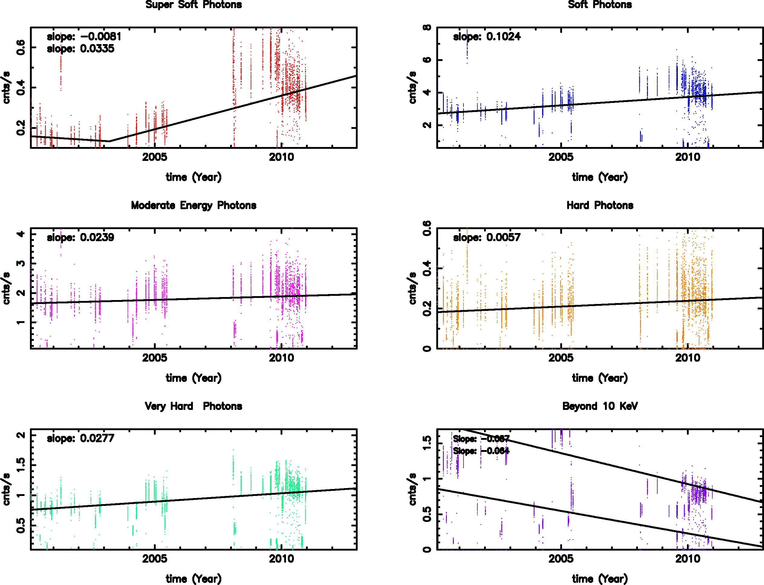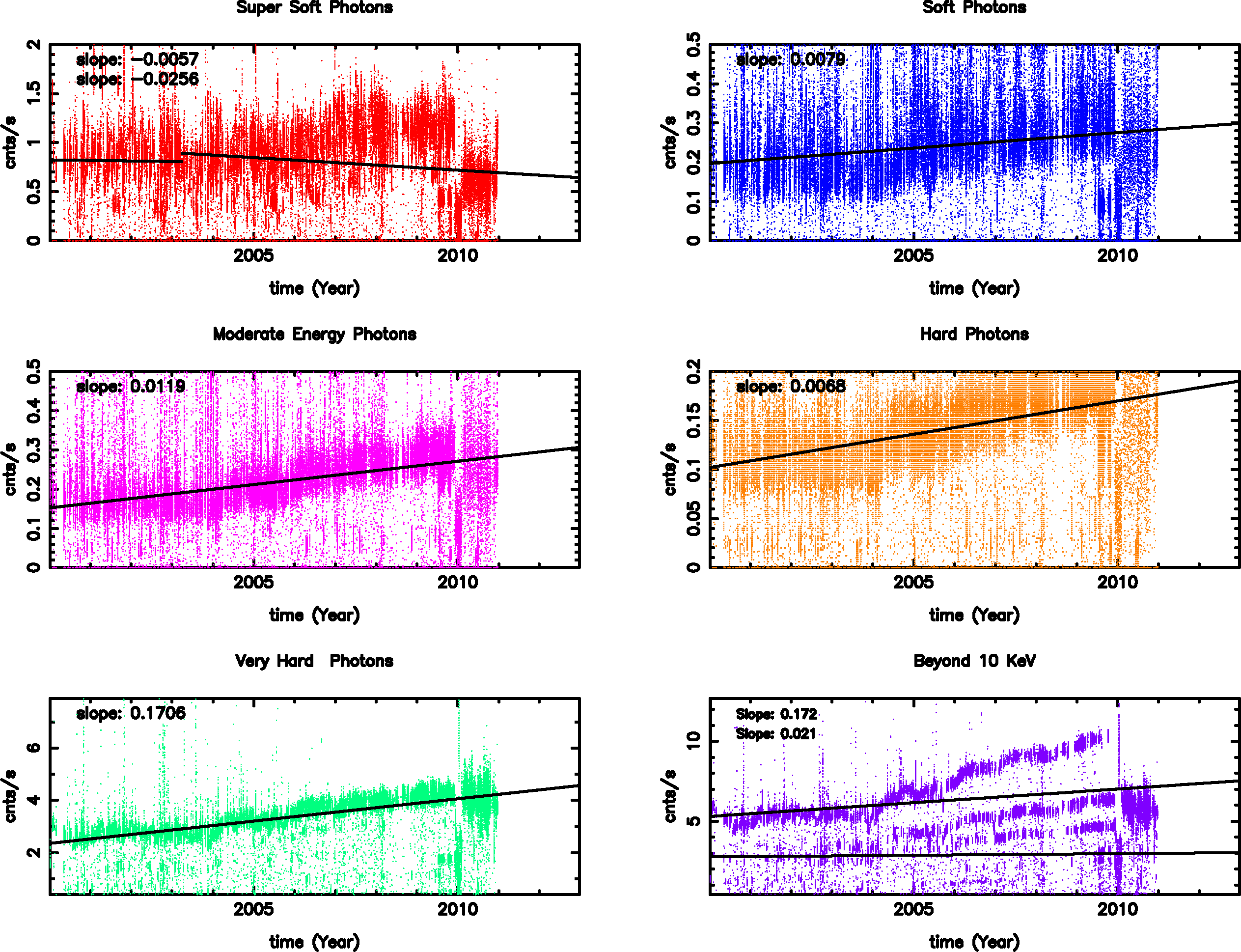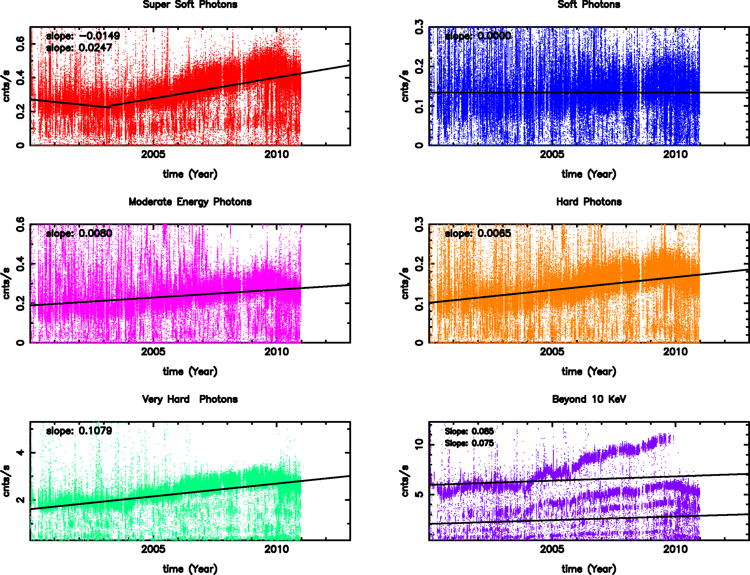 Statistics: # IMAGE NPIX MEAN RMS MIN MAX ACIS_nov10 6004901 8.50 12.93 0.0 582 I2 node 0 262654 10.653687 4.075615 0.0 76.0 I2 node 1 262654 11.987278 5.127126 0.0 257.0 I2 node 2 262654 11.370716 4.308250 0.0 69.0 I2 node 3 262654 11.892551 5.002465 0.0 200.0 I3 node 0 262654 12.467064 4.798858 0.0 49.0 I3 node 1 262654 12.757992 10.850769 0.0 505.0 I3 node 2 262654 11.023073 4.567173 0.0 79.0 I3 node 3 262654 9.951733 3.922087 0.0 159.0 S2 node 0 262654 7.634620 3.220868 0.0 54.0 S2 node 1 262654 8.009213 3.755279 0.0 59.0 S2 node 2 262654 8.274016 3.564673 0.0 88.0 S2 node 3 262654 8.123272 3.826151 0.0 522.0 S3 node 0 262654 16.022419 21.208300 0.0 346.0 S3 node 1 262654 17.890612 12.932301 0.0 105.0 S3 node 2 262654 15.888067 13.434475 0.0 108.0 S3 node 3 262654 7.235115 2.852318 0.0 45.0