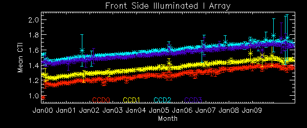 We report CTIs with a refined data definition. CTIs were computed for the temperature dependency corrected data. Please see CTI page for detailed explanation. CTI's are computed for Mn K alpha, and defined as slope/intercept x10^4 of row # vs ADU. Data file: here