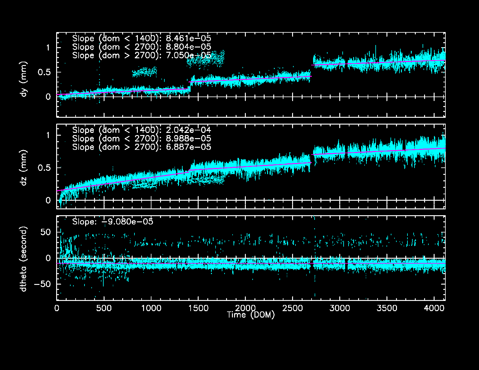 SIM Shift and Twist Trend The following plots show trends of SIM shifts (dy and dz) and twist (dtheta). All quantities are directly taken from pcaf*_asol1.fits files. The units are mm for dy and dz, and degree for dtheta. We fit three lines separated before and after (Days of Mission)= 1400 (May 21, 2003), and 2700 (Dec 11, 2006). The unit of slopes are mm per day or degree per day.